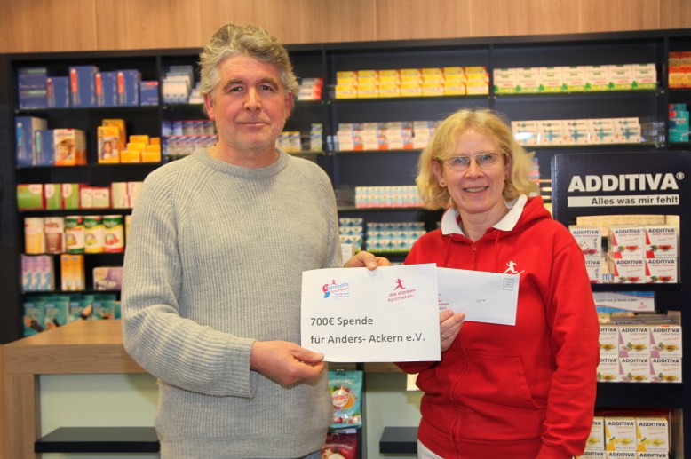 Karin Steinhoff von der Allee Apotheke in Beckum überreichte kürzlich eine Spende in Höhe von 700 Euro an Ludger Bruns vom Verein anders ackern e. V.“.