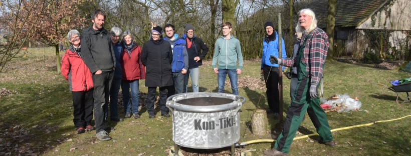 Unsere Freundin Anne Bussmann, die sich aus Gründen des Klimaschutzes für die Erneuerbaren Energien einsetzt, hat sich kürzlich einen Kon-Tiki zugelegt, in dem man recht einfach große Mengen an Pflanzenkohle selbst herstellen kann. In dem Kessel aus Stahlblech wird Biomasse unter Luftausschluss verkohlt und zum richtigen Zeitpunkt abgelöscht – so erhält man hochwertige Pflanzenkohle. Das sauber abbrennende Gas kann gleichzeitig zum Erhitzen von Wasser, zum Grillen, etc. verwendet werden. Den Probelauf haben wir kürzlich erfolgreich auf dem neuen Laakenhof durchgeführt. Auch bei 100% erneuerbaren Energien, die wir so schnell wie möglich brauchen, reicht es nicht, die Klimaschutzziele von Paris zu schaffen. Deshalb ist es notwendig aus der Atmosphäre Co2 zurück zu holen. Dieses kann durch die Erzeugung von Terra Preta im Kontiki passieren.