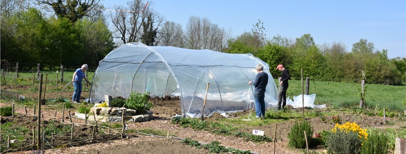 Nachdem wir vor einigen Wochen bereits das Grundgerüst aufgestellt haben, wurde gestern eine Folie über die Metalbögen gezogen. Diese wurde seitlich zwei-spatentief im Erdreich eingelassen und mit Ankern und Schnüren stabilisiert.