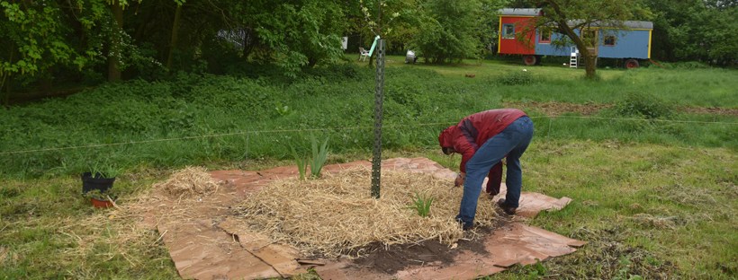 Im Radius von einem Meter um die bereits gepflanzten Obstbäume haben wir zuerst unbedruckte, große Pappkartons ausgelegt, diese mit Komposterde und Stroh bedeckt, und dann mit Lilien, Gundermann, Meerrettich und Kappuzinerkresse bepflanzt.