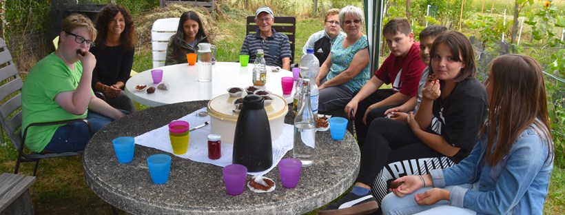 Zum Abschluss des Schuljahres haben sich die Schülerinnen und Schüler der Garten AG der Gesamtschule Neubeckum/Ennigerloh noch einmal im Interkulturellen Garten getroffen, um bei Muffins und Apfelschorle eauf das vergangene Jahr zurück zu blicken. Ein durchweg positives Resümee kam bei der Fragerunde hervor, ein großes „Dankeschön“ ging an Annemarie & Werner Koblentz, die Lehrerin Viola Deister immer tatkräftig zur Seite standen.