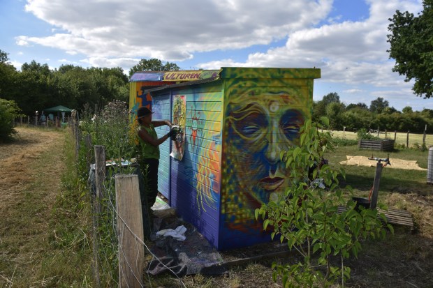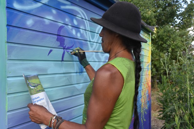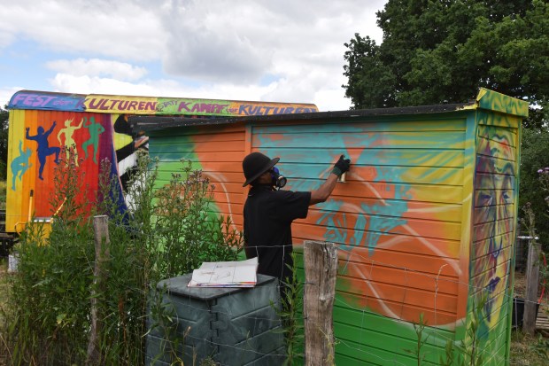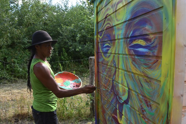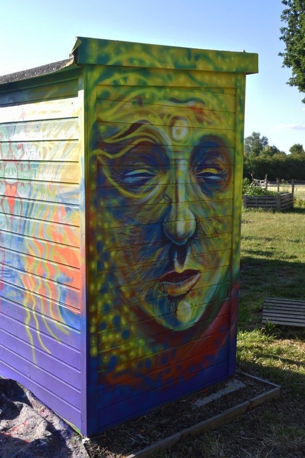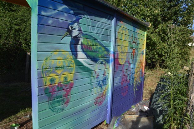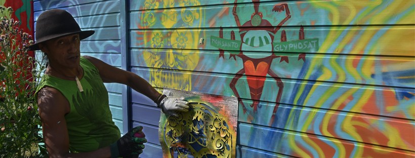 Unser Künstler-Freund Jorge Hidalgo hat im Interkulturellen Garten ein weiteres Mal zu Pinsel und Sprühflasche gegriffen, um die Rückseite unseres Kompostklos zu verschönern. Echt beeindruckend mitzubekommen, wie diese Kunstwerke entstehen.