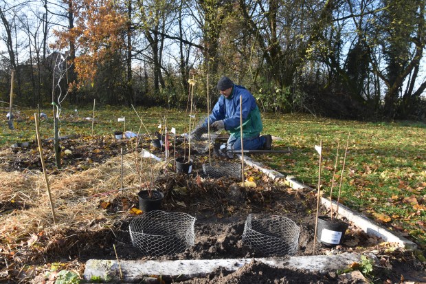 Während eines Pflanzseminars hat uns Cornelia vermittelt, worauf beim Pflanzen und beim ersten Pflanzschnitt zu achten ist. Eine schweißtreibende Arbeit, denn alle Pflanzlöcher wurden zuerst mit Wühlmauskörben ausgestattet, bevor die jeweilige Pflanze eingebracht werden konnte.