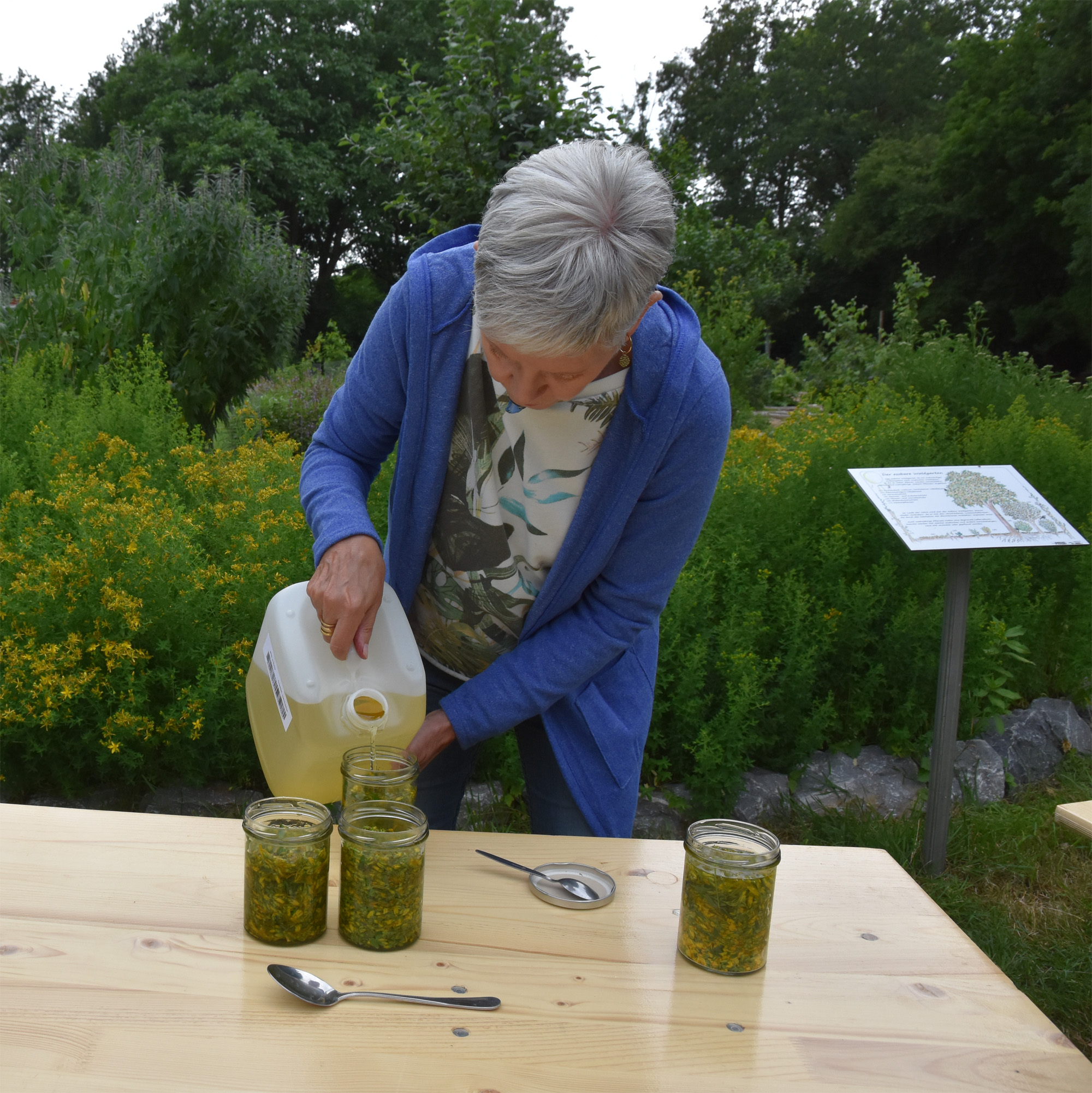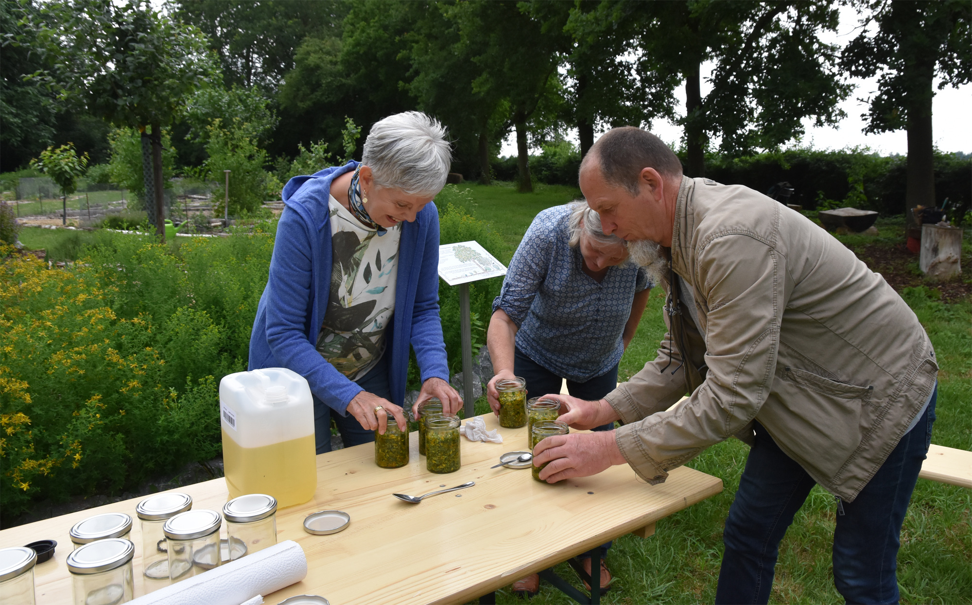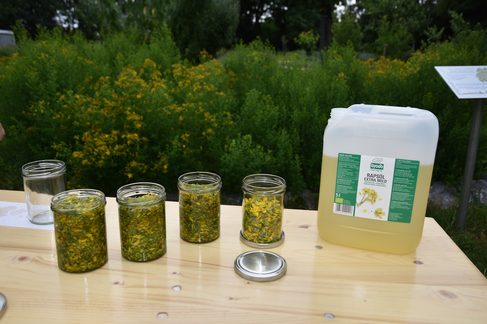Passend zum Johannistag hat Bärbel Heichel dem Permakultur-Waldgarten-Team gezeigt, wie aus dem echten Johanniskraut ein wertfolles Heilöl hergestellt werden kann, welches bei strapazierte Muskeln und Gelenken, sowie problembehafteter Haut wohltuend einsetzbar ist.