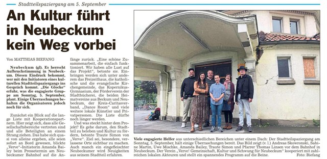 Der Verein Verve e.V. organisiert gerade für Sonntag, den 05. September zusammen mit einigen Kooperationspartner*innen einen kulturellen Stadtteilspaziergang in Neubeckum. Es geht dabei um das Erkunden und neu Entdecken des Stadtteils Neubeckum über hauptsächlich künstlerische Aktionen / Angebote lokaler Künstler*innen oder Anwohner*innen, die sich gerne kreativ einbringen möchten.