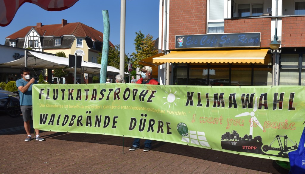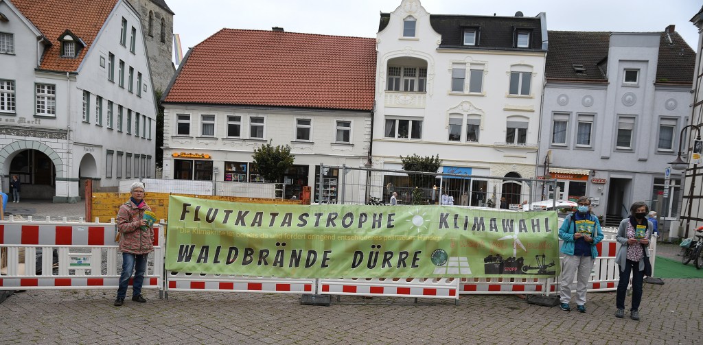 Besorgte Bürger haben mit einem großen Banner auf verschiedenen Mahnwachen in Beckum, Neubeckum, Ennigerloh und Ahlen auf die dramatischen Folgen des Klimawandels aufmerksam gemacht. Die Buschbrände in Australien 2020, Hitzerekorde in Kanada, Waldbrände in Sibirien und Südeuropa, und nun die Flutkatastrophe in Rheinland-Pfalz und Nordrhein-Westfalen zeigen uns auf höchst erschreckende Weise auf, dass der Klimawandel weltweit schlimmste Schäden verursacht, Menschenleben kostet.
