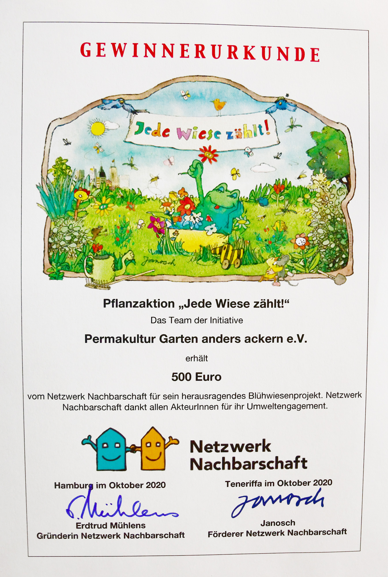 Das anders ackern e.V. Projekt „Permakultur Waldgarten“ wurde ja vor einiger Zeit unter vielen ambitionierten Einreichungen aus ganz Deutschland von der Jury der Aktion „Jede Wiese zählt!“ des Netzwerks Nachbarschaft ausgezeichnet, und hat den Hauptpreis von 500 Euro gewonnen.