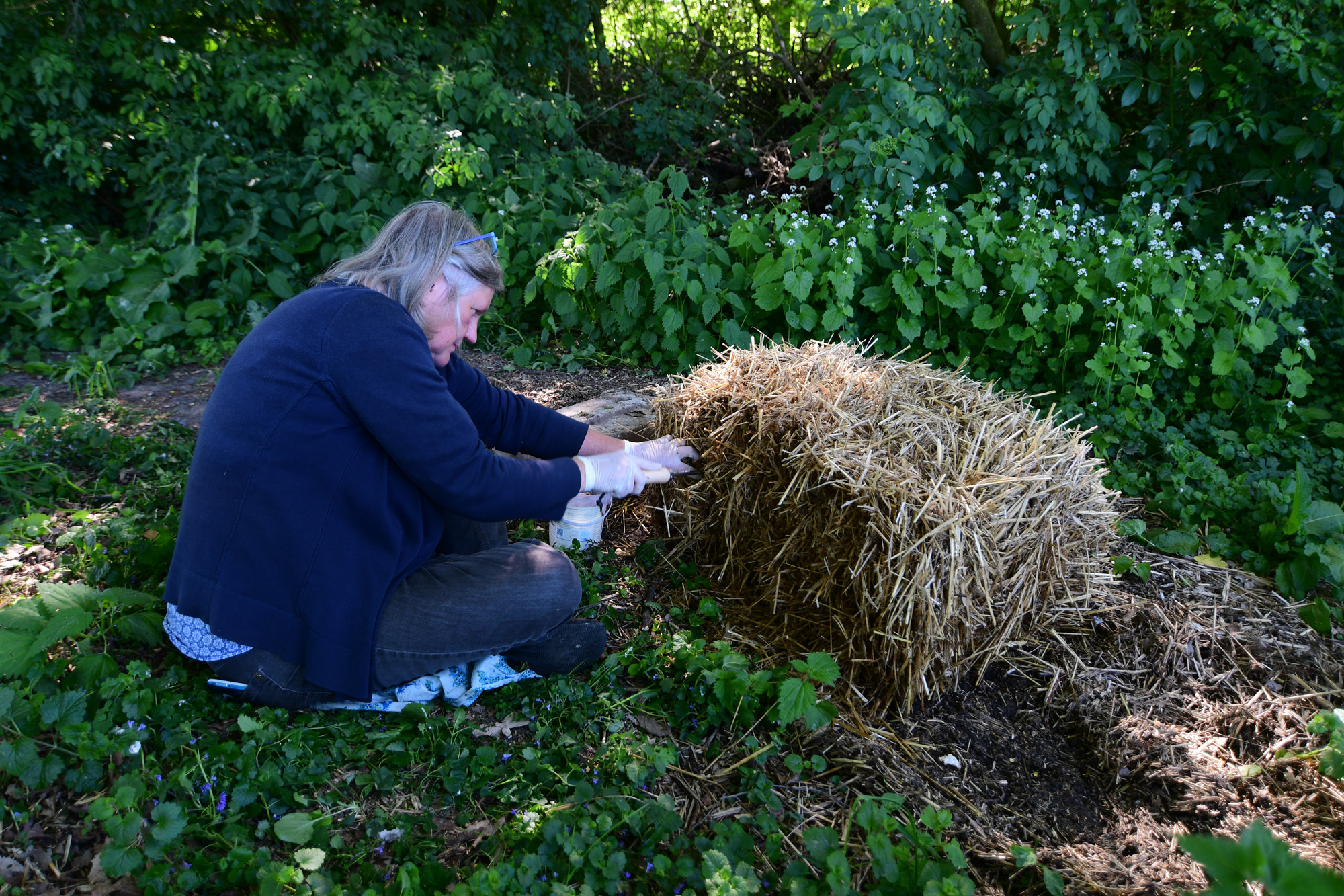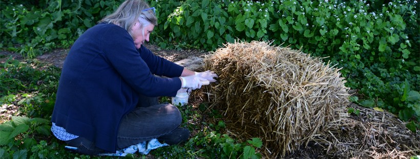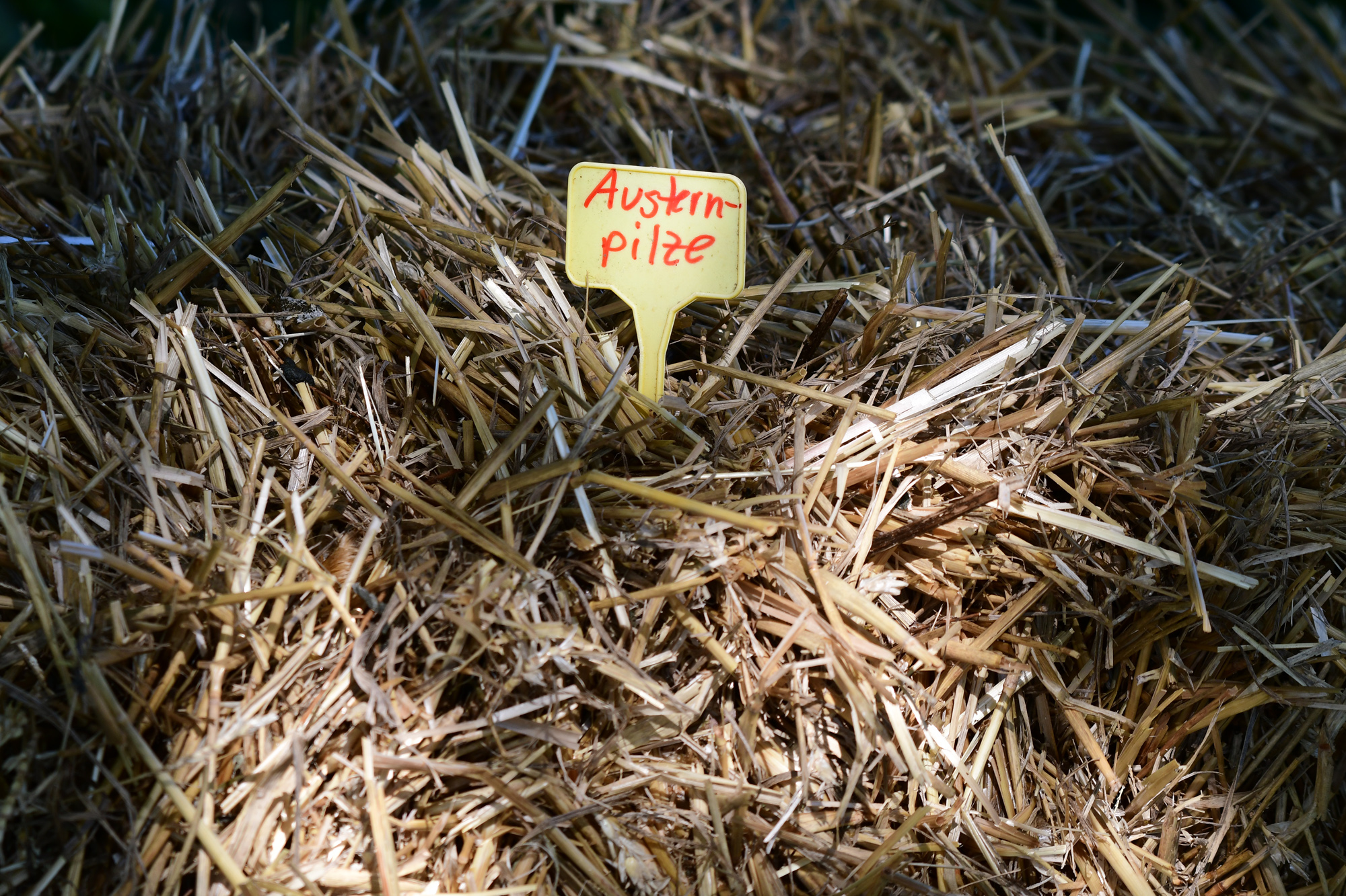 Dazu haben wir kürzlich einen über 12 Stunden in Wasser getränkten Strohballen mit Austernpilz-Myzel beimpft. Eine walnussgroße Menge der mit Austernpilz beimpften Holzchips wurden um den Strohballen herum verteilt 10 bis 15 cm tief eingebracht, die Impflöcher danach gründlich wieder verschlossen. Nach etwa vier bis sechs Wochen soll die Strohballenkultur mit dem weißgrauen Pilzmyzel durchwachsen sein. Die ersten Edelpilze zeigen sich, wie Wildpilze auch, bei 10 – 20° C und vorwiegend feuchter Witterung.