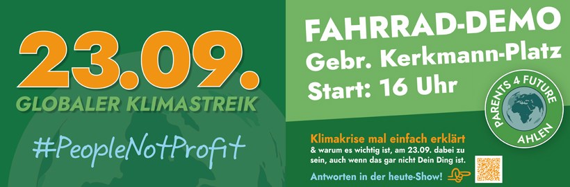Die Ahlener Parents for Future – Gruppe ruft zur Teilnahme an einer Fahrraddemo am weltweiten Klimaaktionstag am Freitag, den 23. September auf. Die Tour startet um 16:00 Uhr am Gebr. Kerkmann-Platz und geht einmal mit dem Rad um die Ahlener Innenstadt.