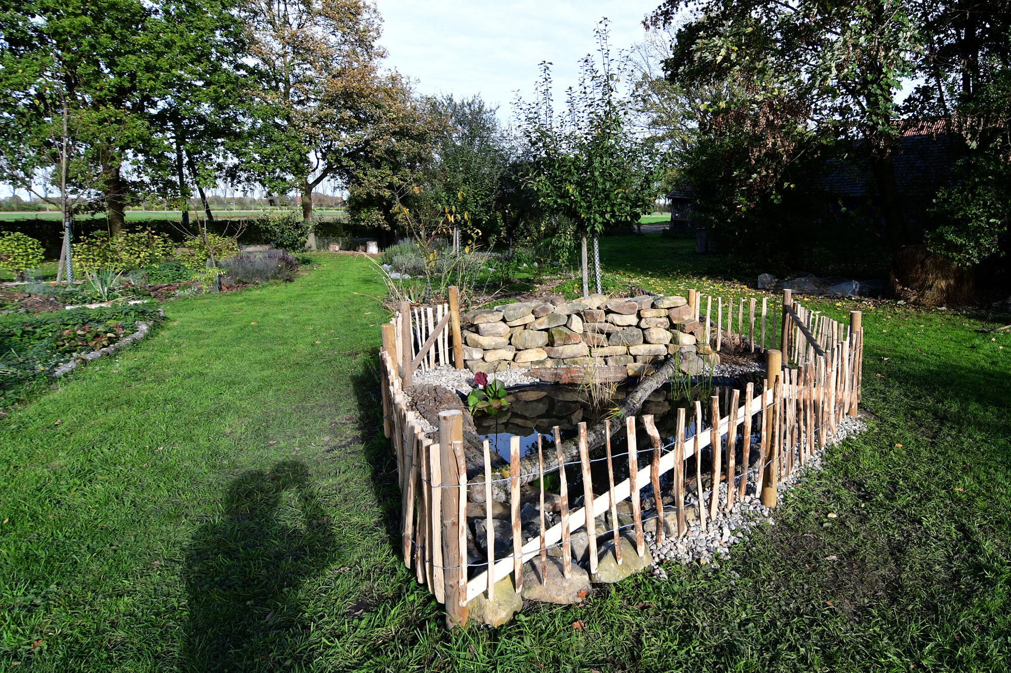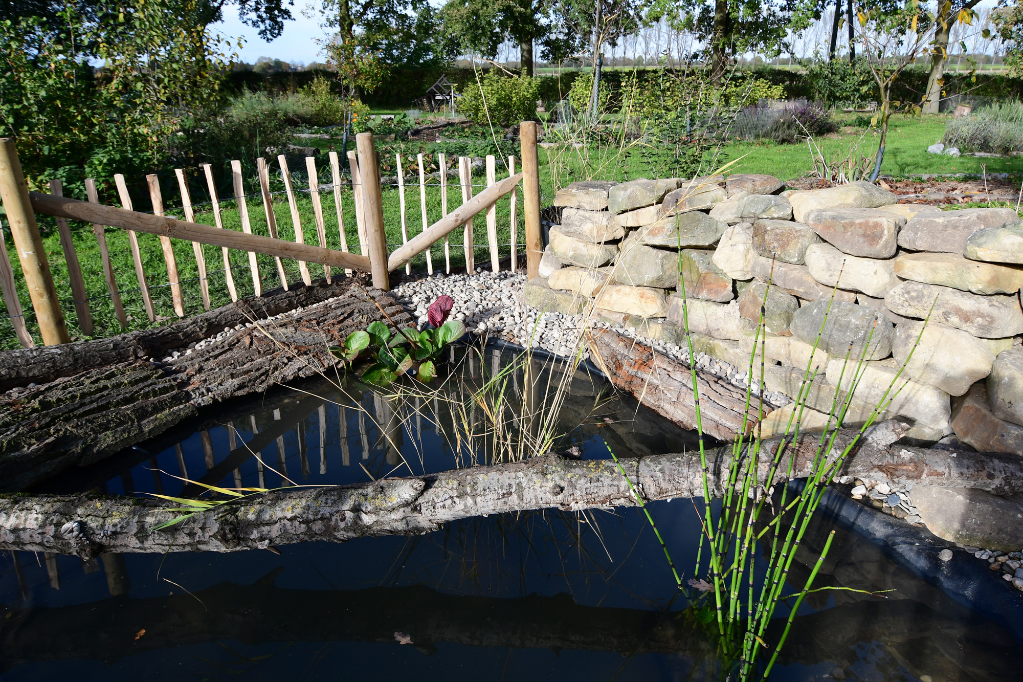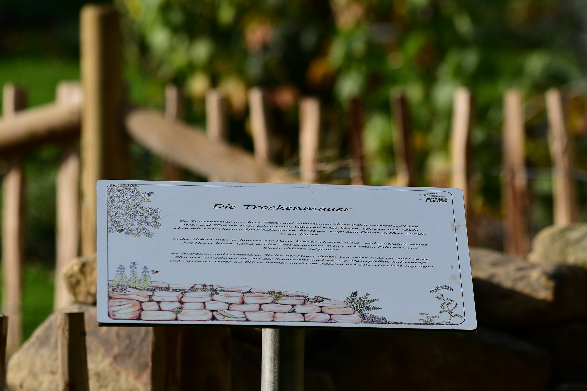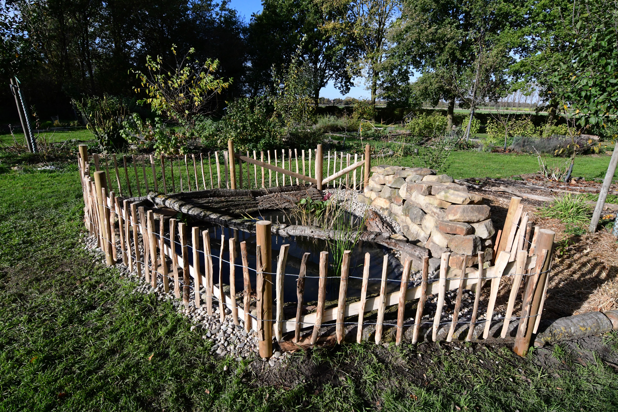 Was lange währt… Seit einigen Tagen gibt es auf einer Parzelle im Permakultur Waldgarten vom Verein anders ackeren e.V. eine Trockenmauer und einen kleinen Teich, neuer, wertvoller Lebensraum für Pflanzen und Tiere. Während Mauerbienen, Spinnen und Asseln schon mit einem kleinen Spalt in der Trockenmauer auskommen, können in den Hohlräumen im Inneren Wespen, Wald- und Zwergspitzmäuse ihre Nester bauen. Gerne werden Trockenmauern auch von Kröten, Eidechsen und Blindschleichen aufgesucht.