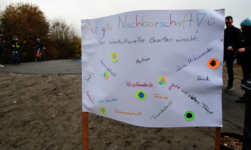In direkter Nachbarschaft zum Interkulturellen Garten Neubeckum ist in den letzten Monaten ein Pumptrack errichtet worden. Mitglieder des Interkulturellen Garten-Teams haben zur offiziellen Eröffnung des Pumptracks dort Apfelpunsch ausgeschenkt, die Schüler*innen der Garten AG haben ein Plakat zur Eröffnung erstellt.