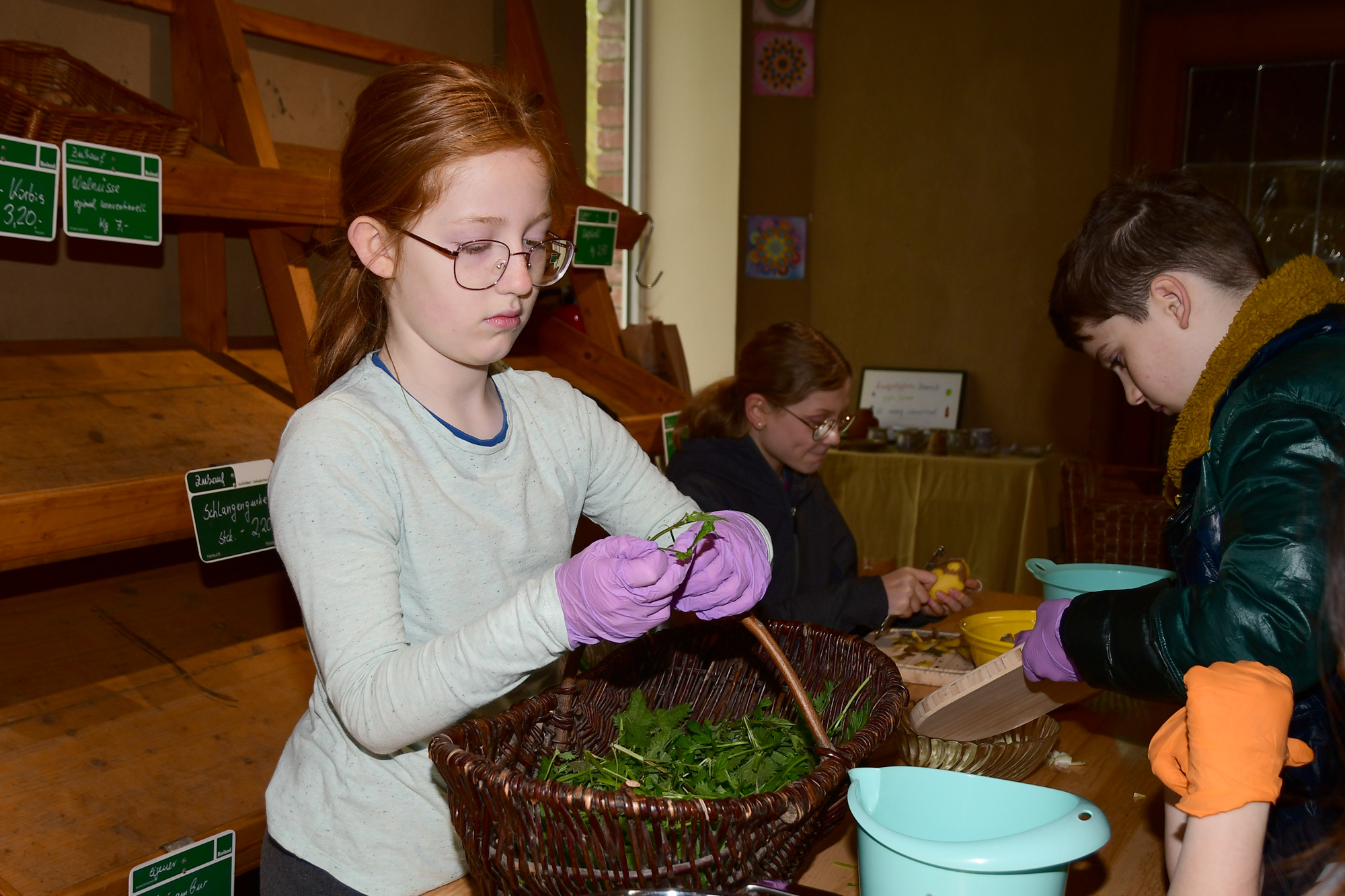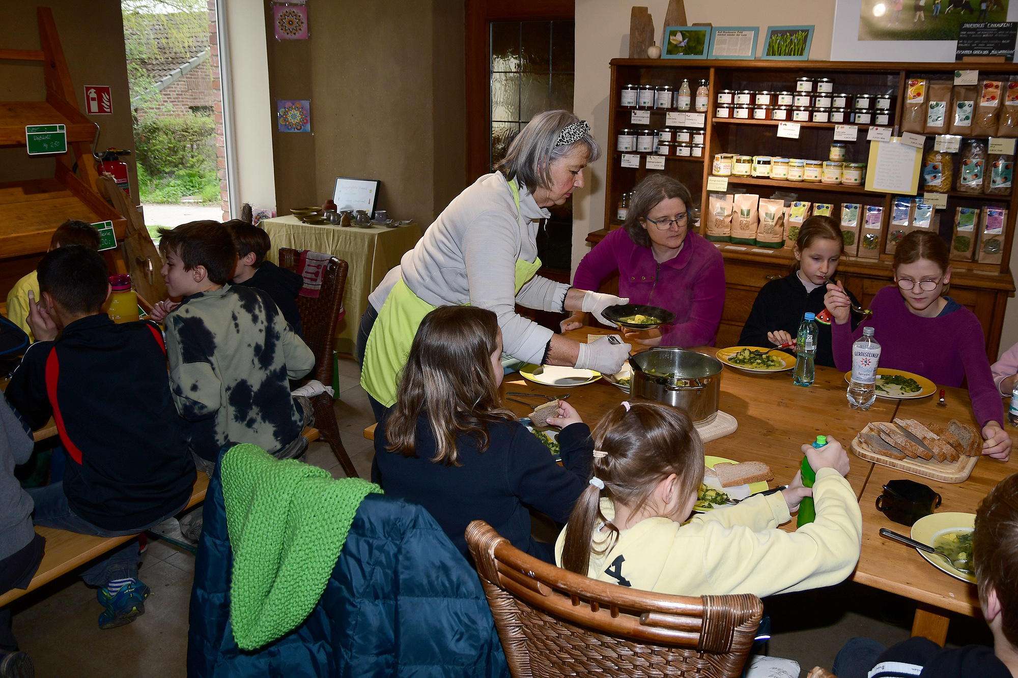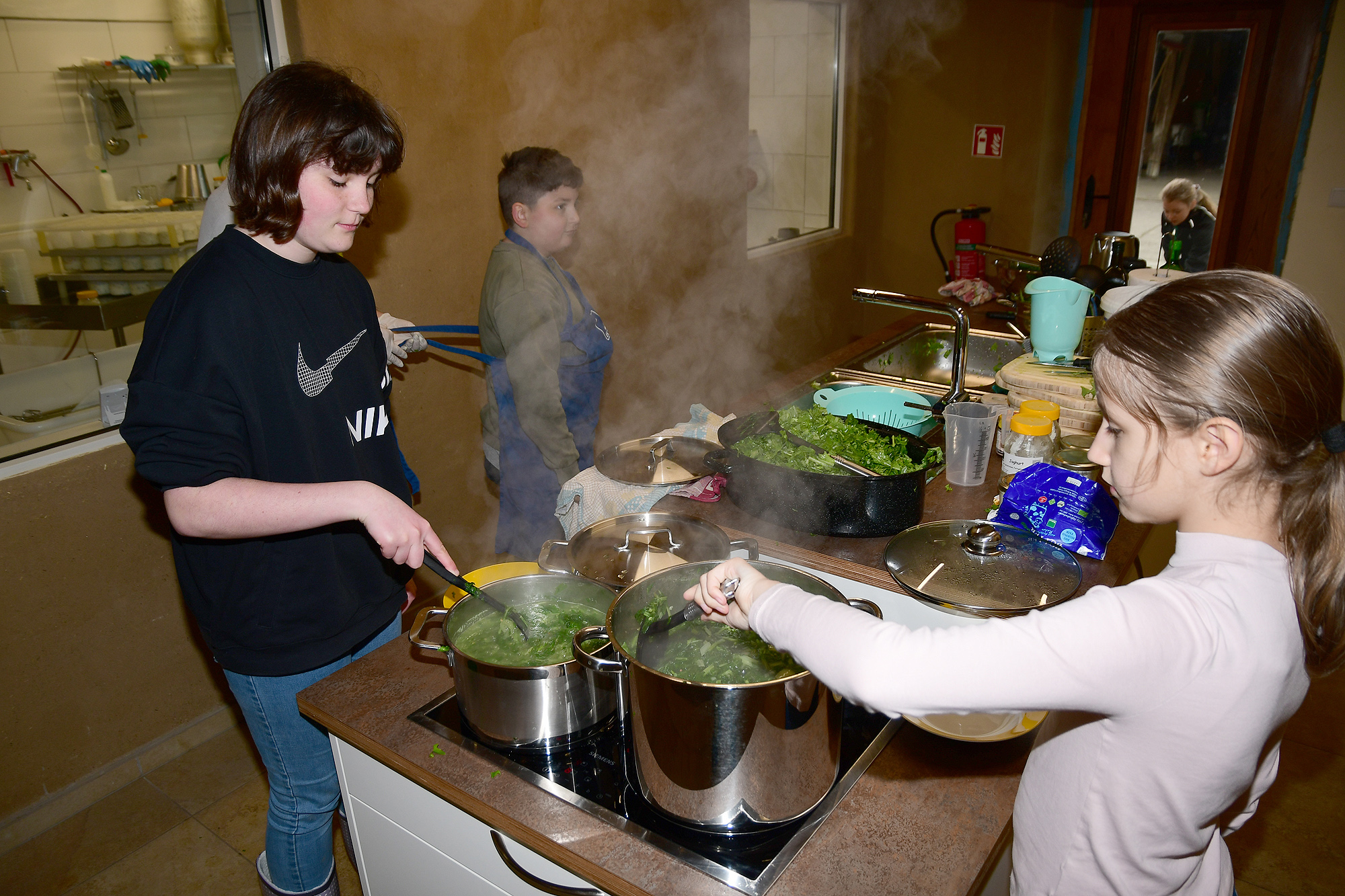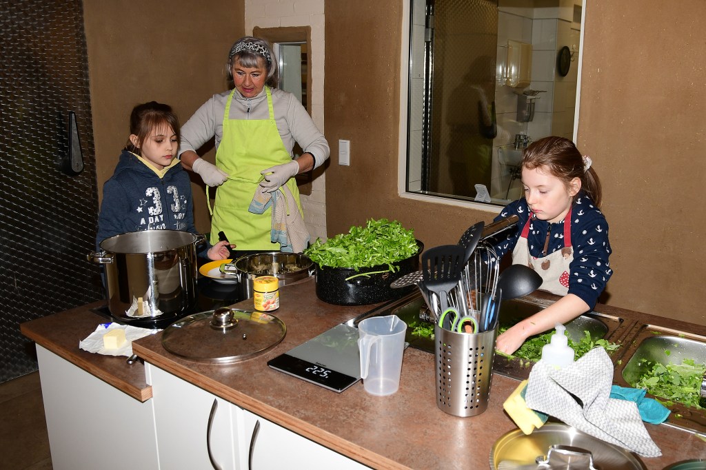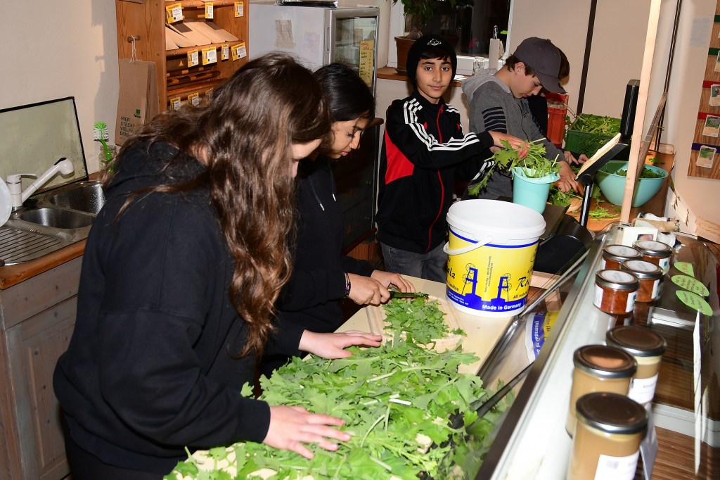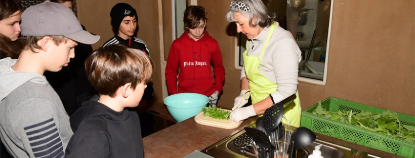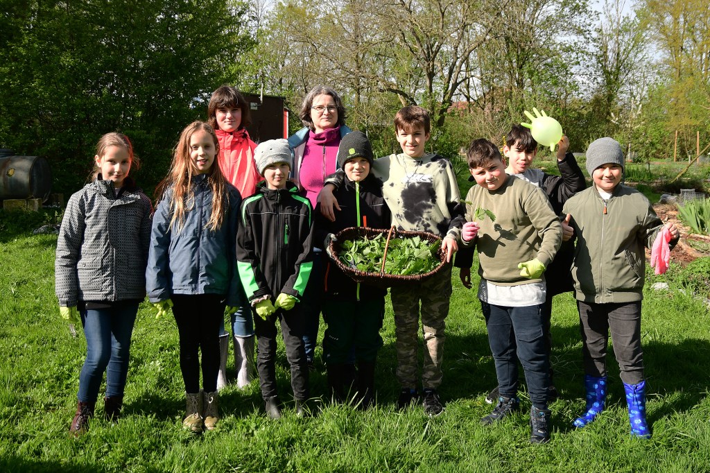 Die in 3 Kleingruppen aufgeteilten Schüler*innen haben zuerst mit viel Eifer und Spaß im Permakultur Waldgarten Brennessel, im Folientunnel Stilmus, und im Freiland Rettich geerntet. Unter fachgerechter Anleitung von Regine und Anja wurden die Zutaten dann gewaschen, zerkleinert und nach entsprechenden Rezepten verkocht. Hierbei war Teamarbeit gefragt, jeder Schüler/Schülerin hatte seine Aufgabe. Das gemeinsame, selbst gekochte Mittagessen war ein tolles Team-Erlebnis und eine neue Erfahrung für die Schulklasse. Nach einem gemeinschaftlichen Austausch am Tisch standen natürlich noch die Aufräumarbeiten an. Auch beim spülen, fegen und wischen haben die Kids ihre Aufgaben gewissenhaft erledigt. Ein dickes Lob vom Seminarküchen-Team!