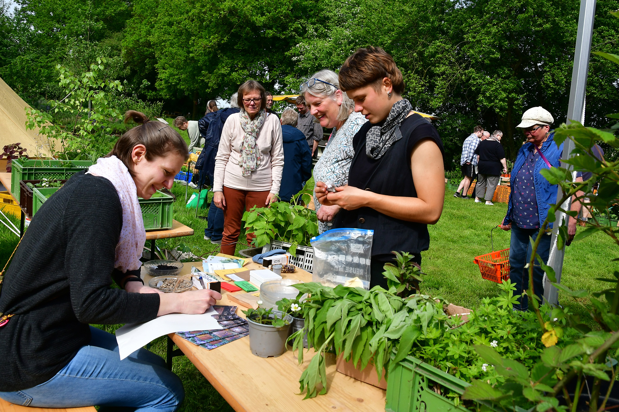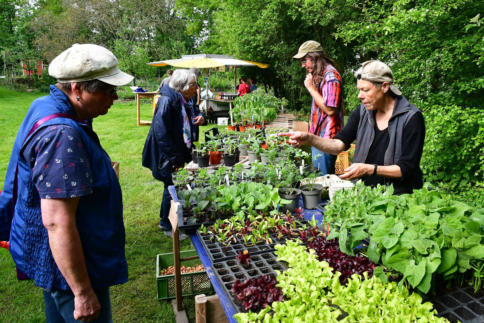 Zum Start in die neue Gartensaison fand auf dem Laakenhof im Permakultur Waldgarten ein Jungpflanzenmarkt statt. Eine breite Palette von Kultur- und Zierpflanzen aus eigener Anzucht wurde angeboten. Mit dabei war der Hof Feldmann aus Sünninghausen mit weiteren Jungpflanzen, Guderun & Markus mit vielen verschiedenen Tomatenpflanzen, sowie die Initiative „Mutter Erde Saaten“, die samenfestes Saatgut aus eigener Vermehrung angeboten hat. Eine Pflanzen Tauschbörse hat das Permakultur Waldgarten Team organisiert. Auch zwei Messerschleifer waren vor Ort. Sie hatten alle Hände voll zu tun, um stumpfe Messer und Gartenwerkzeuge wieder scharf zu bekommen…