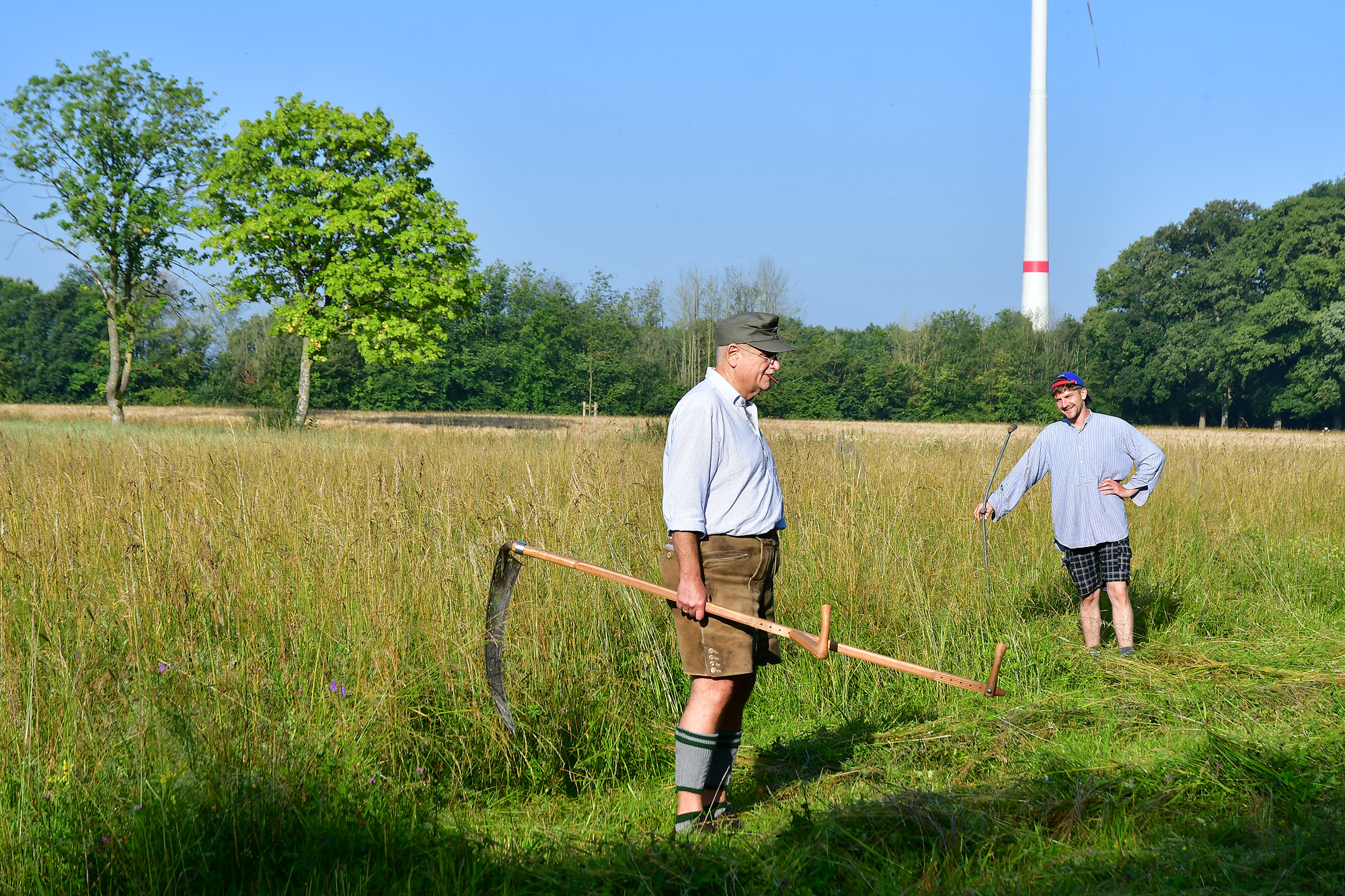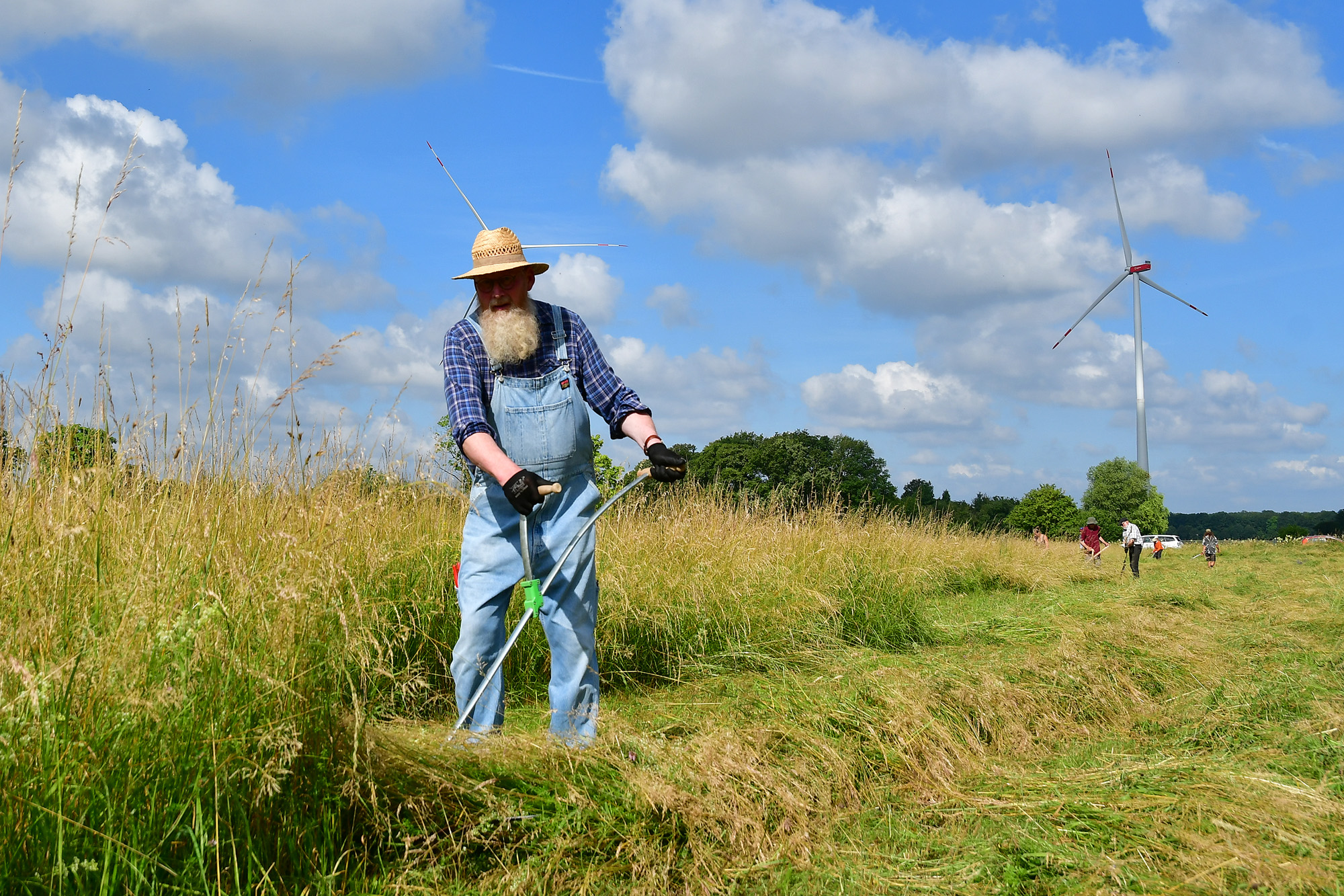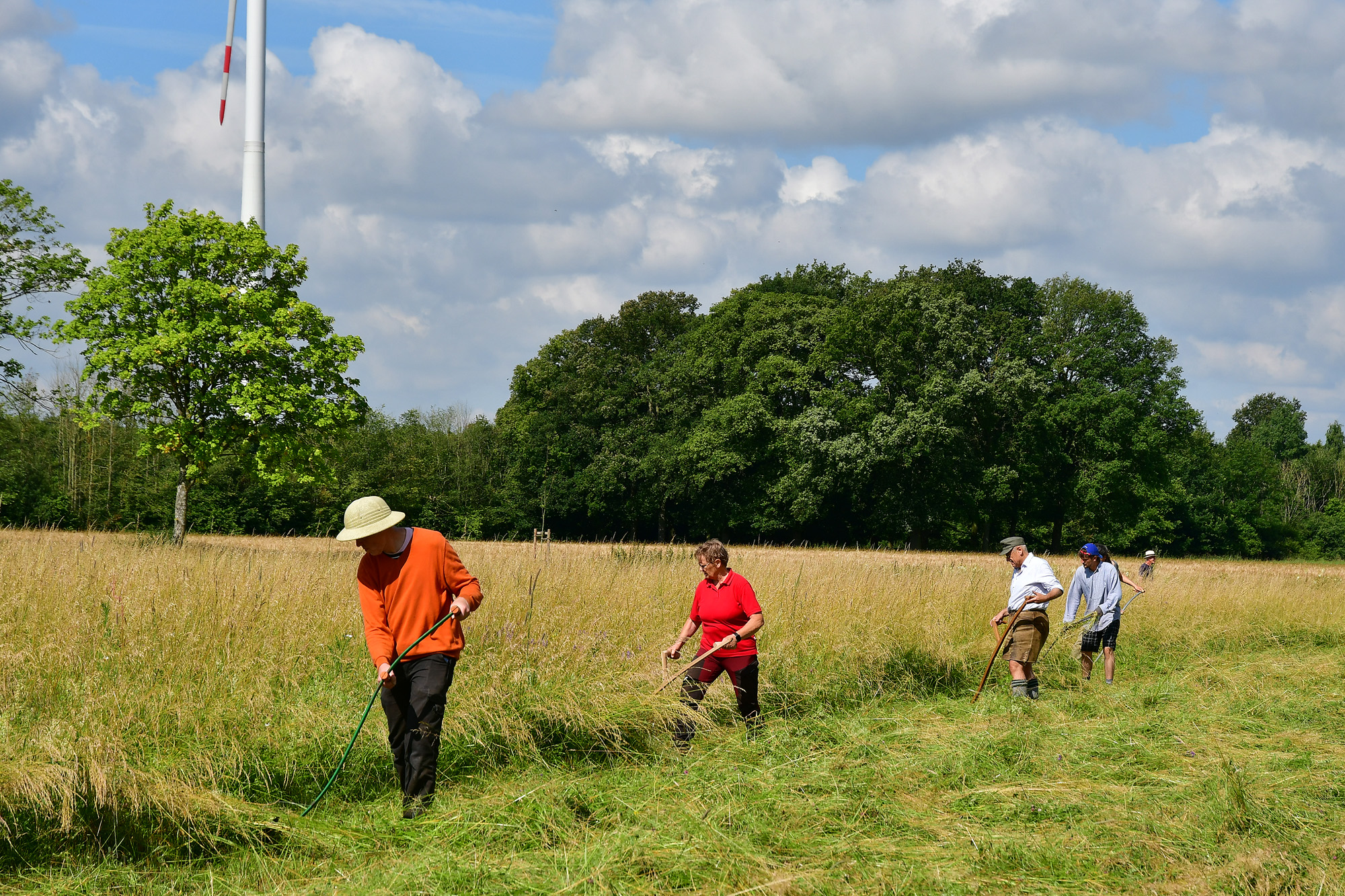 Die Naturschutzwiesen auf dem Laakenhof zeichnen sich durch eine besondere Vielfalt an Pflanzen- und Insektenarten aus. Um diese Artenvielfalt zu schonen, haben wir in diesem Jahr eine der Wiesen mit der Sense gemäht.