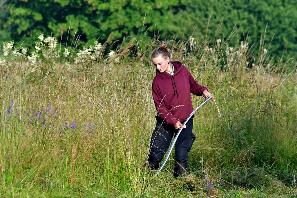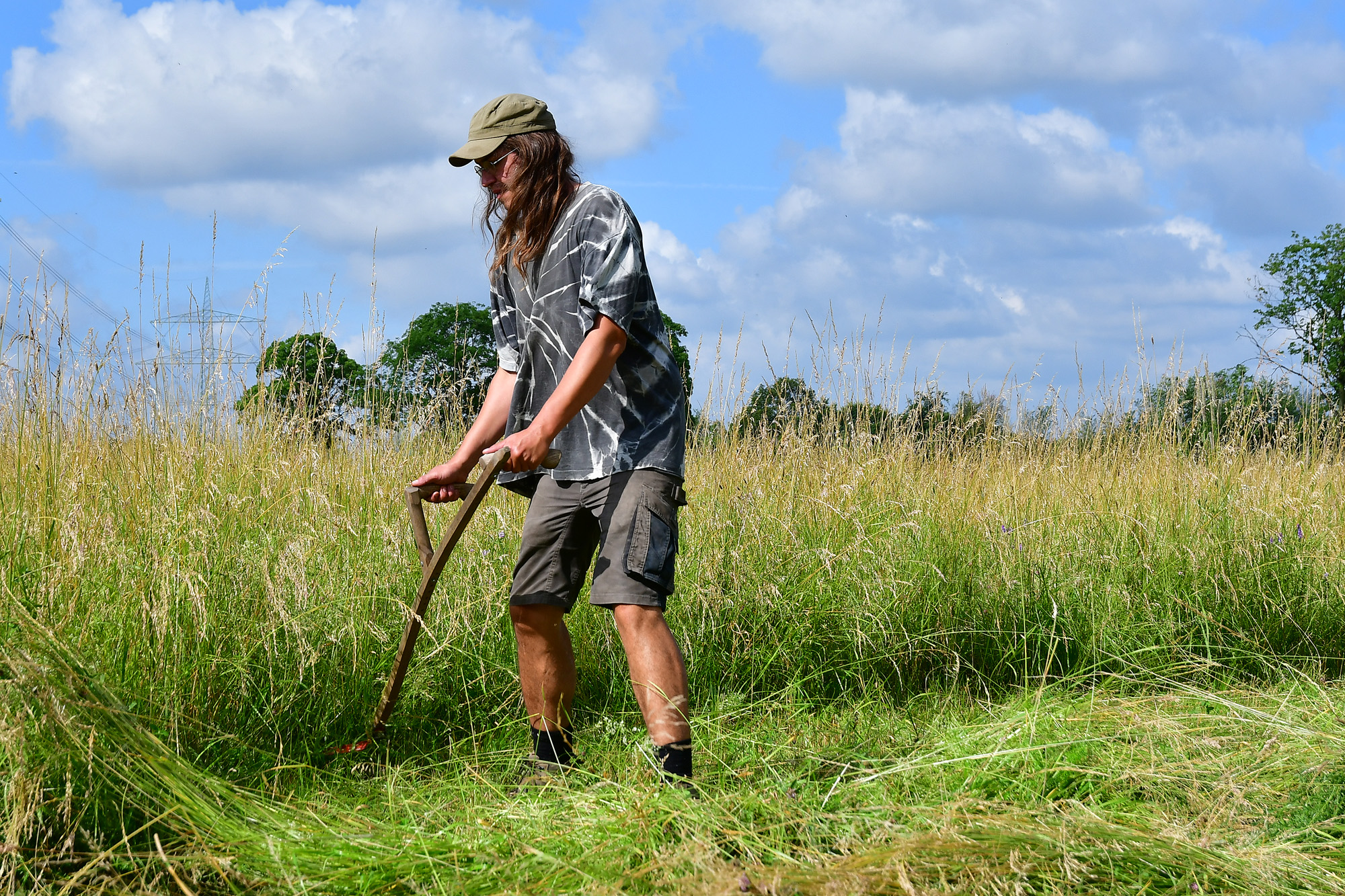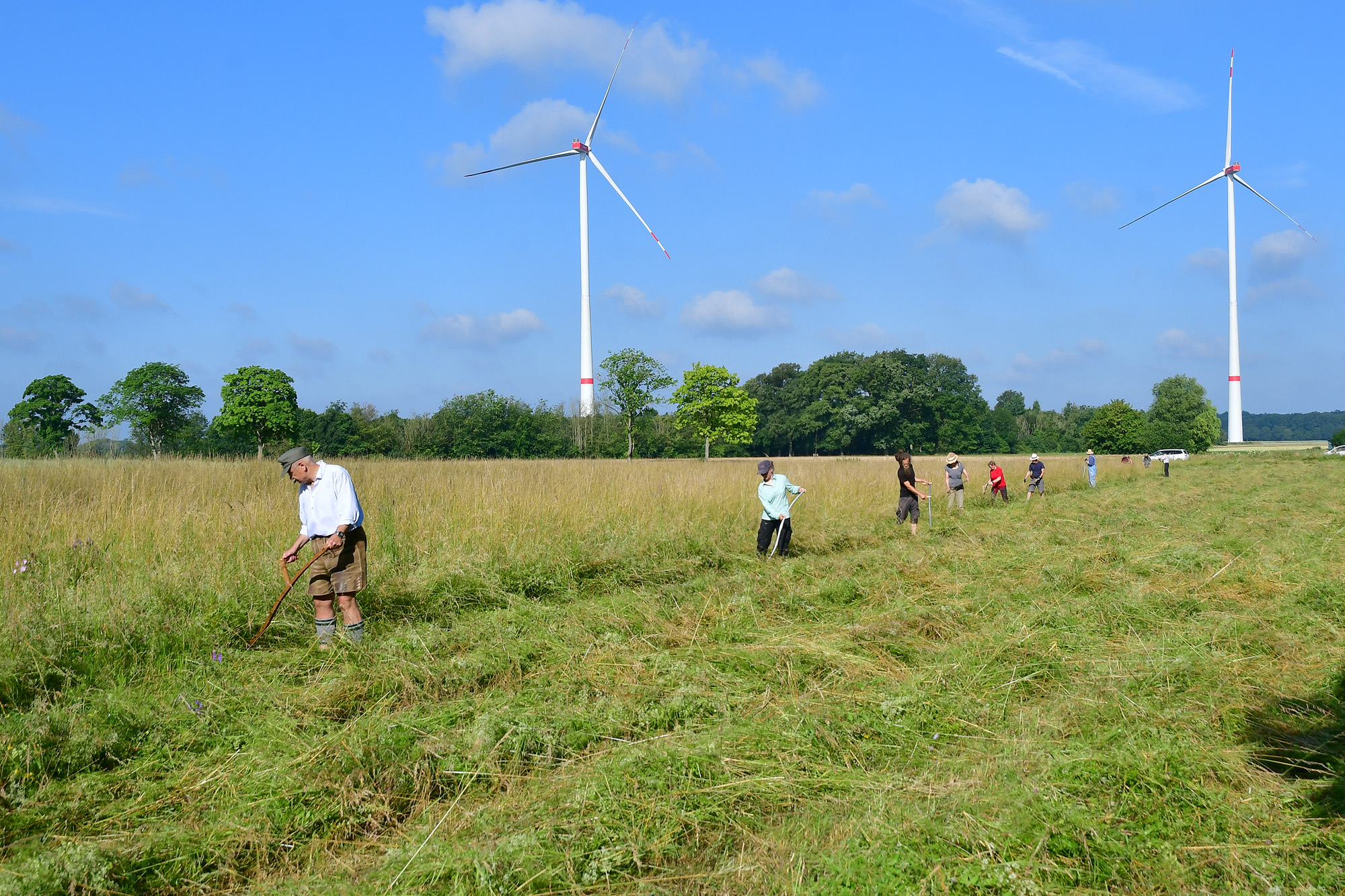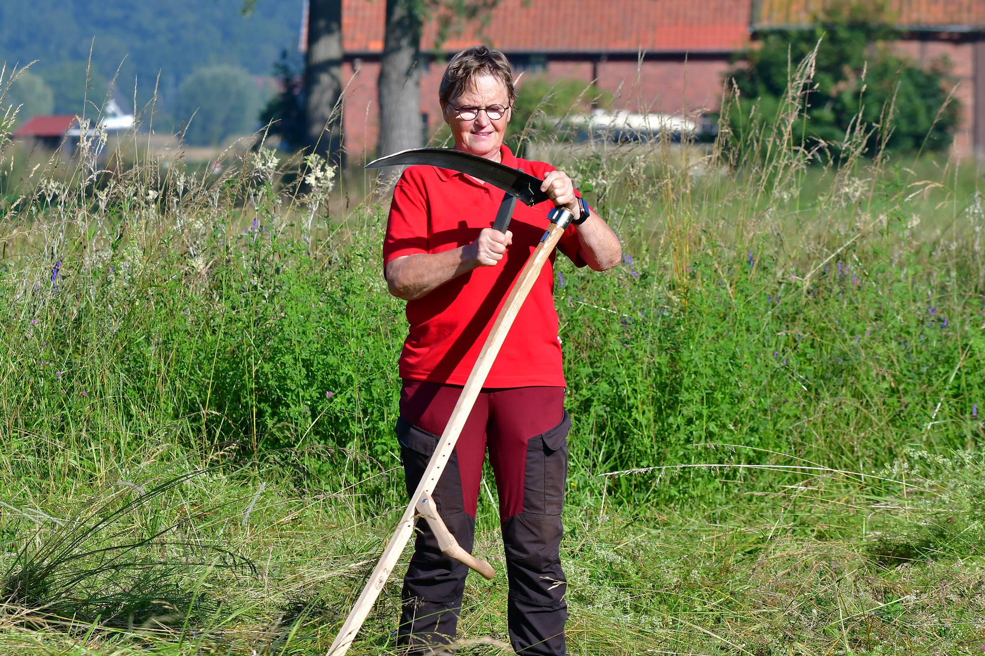 Die Naturschutzwiesen auf dem Laakenhof zeichnen sich durch eine besondere Vielfalt an Pflanzen- und Insektenarten aus. Um diese Artenvielfalt zu schonen, haben wir in diesem Jahr eine der Wiesen mit der Sense gemäht.