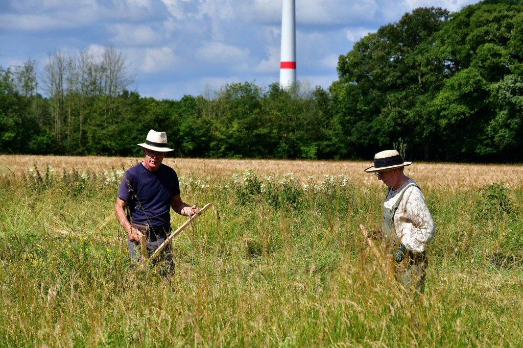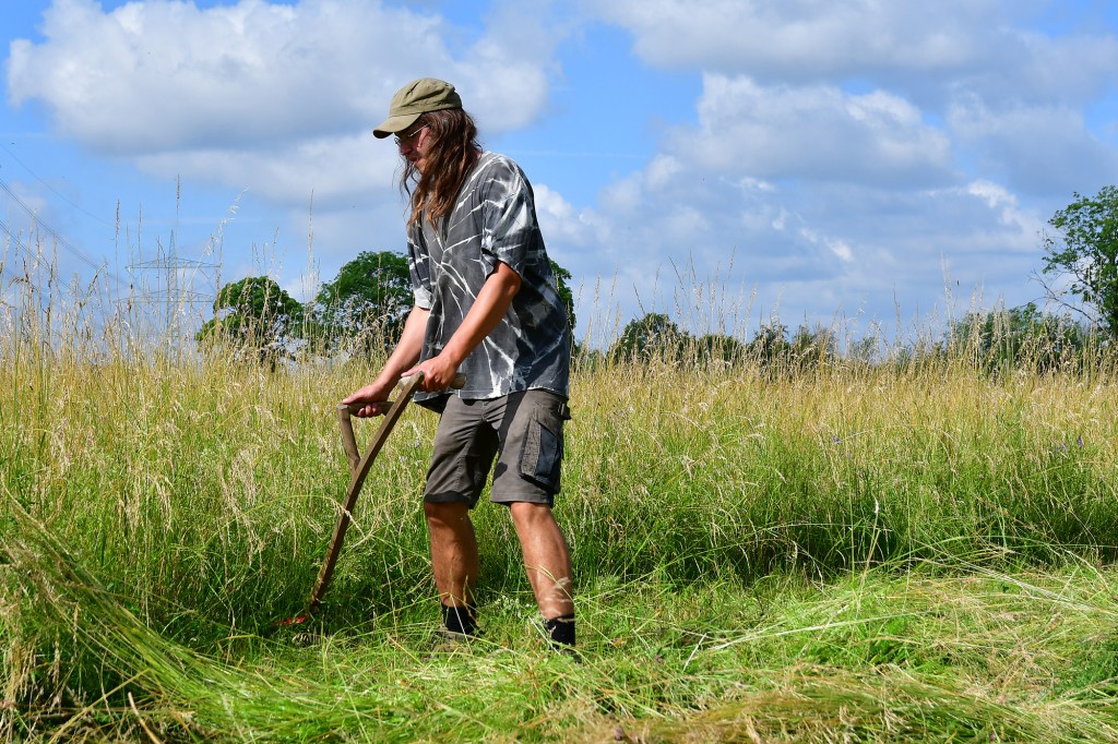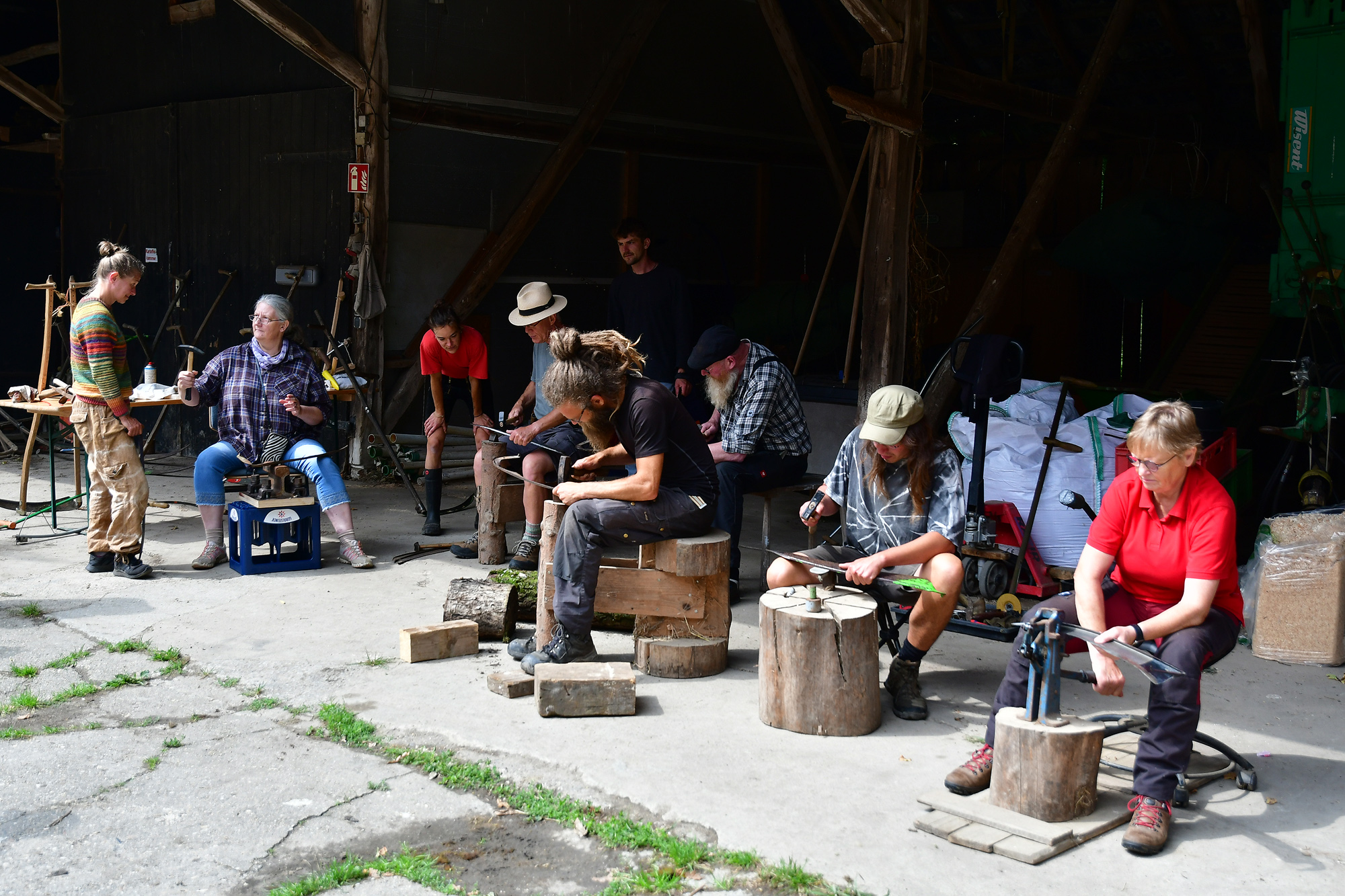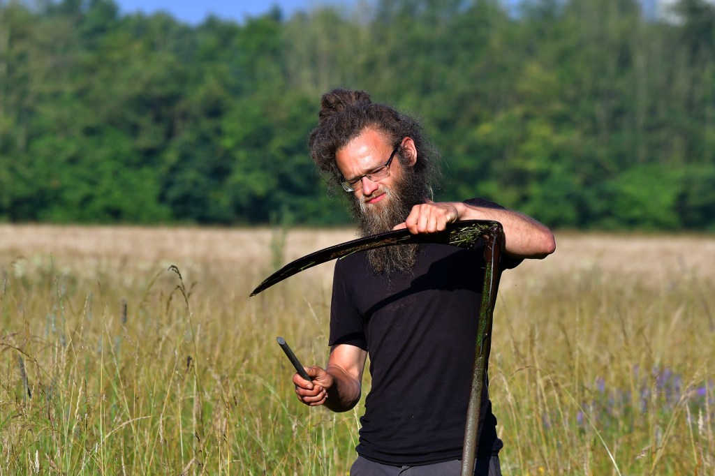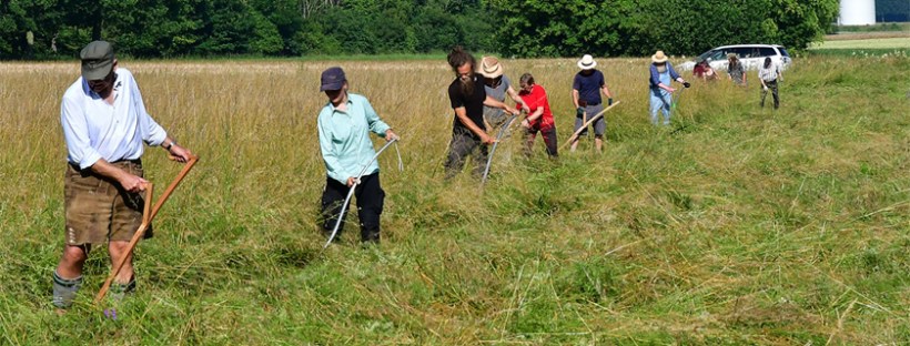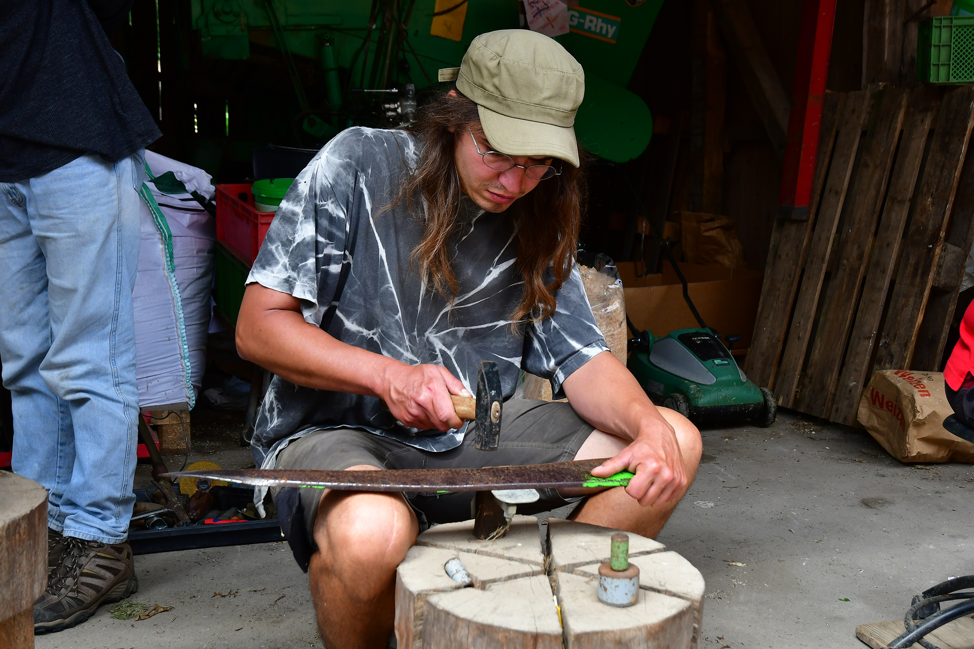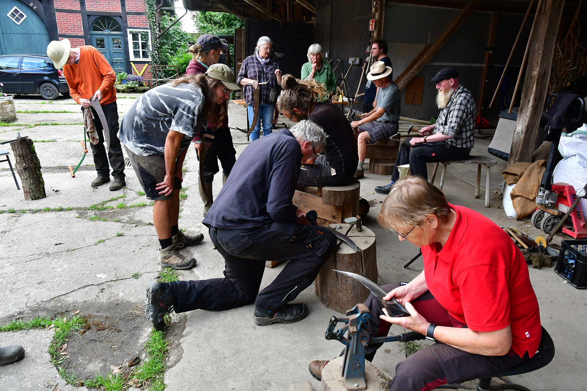 Zuvor hat Bioland-Kollege Rudolf Mathweis einer Gruppe von 15 Personen den richtigen Umgang (Dengeln, Schärfen, Mähen) mit der Sense in einem Kurs nähergebracht. Um hohes Gras mit der Sense zu schneiden, muss das Sensenblatt natürlich scharf sein, was durch das sogenannte Dengeln erreicht wird. Hierbei wird die Schneide des Sensenblattes mit kurzen Dengelhammer Schlägen so lange bearbeitet, bis die gewünschte Schärfe erreicht ist.