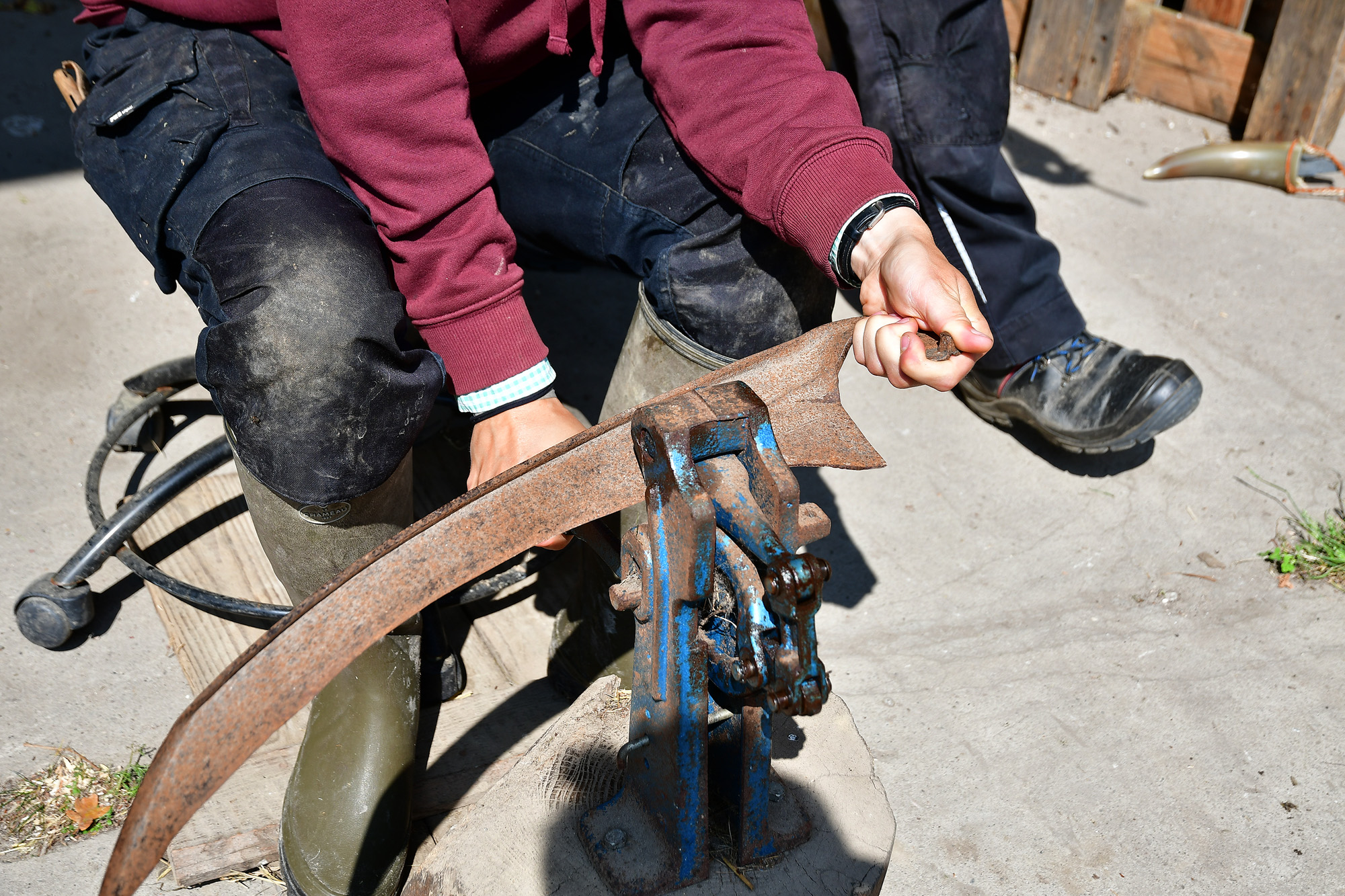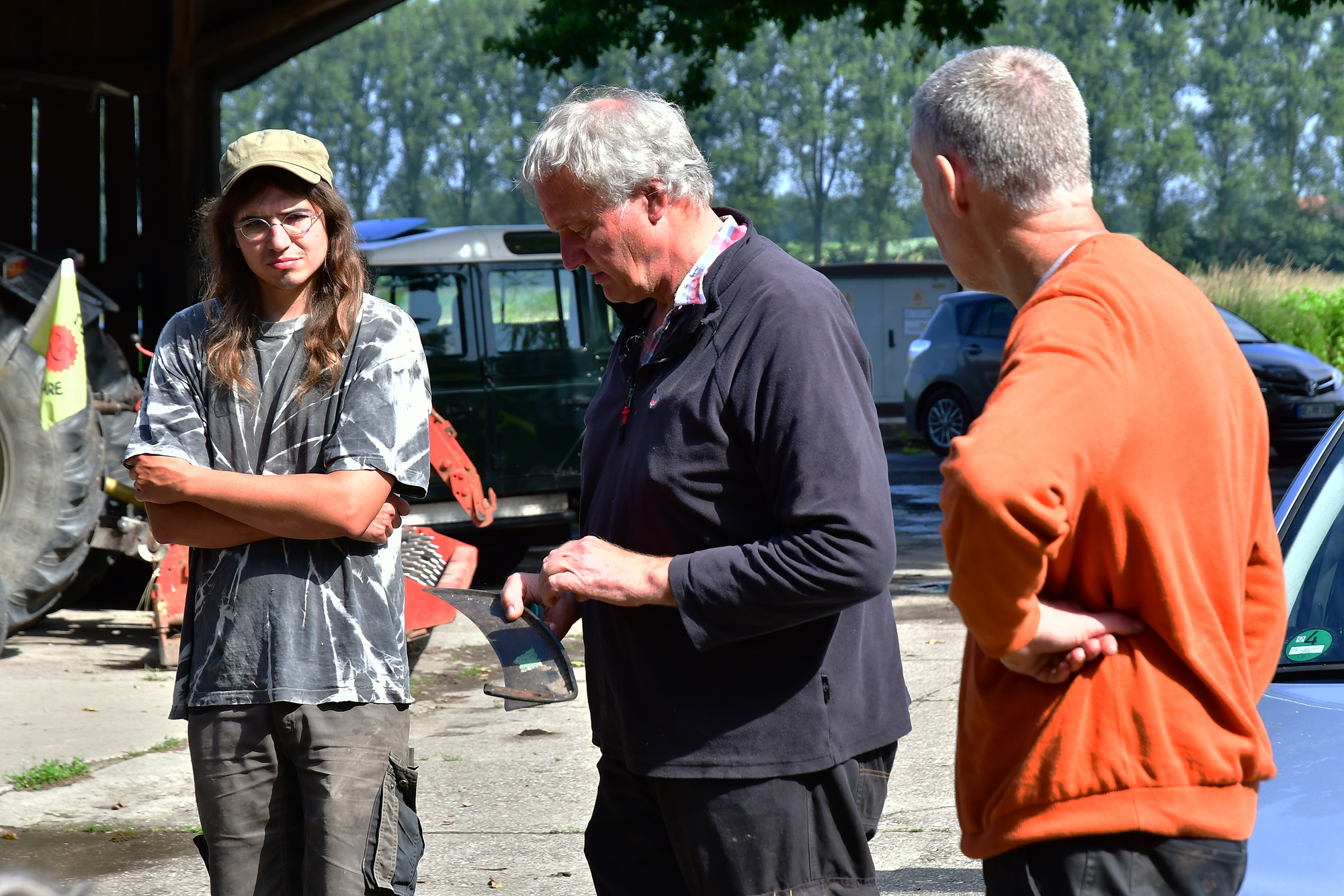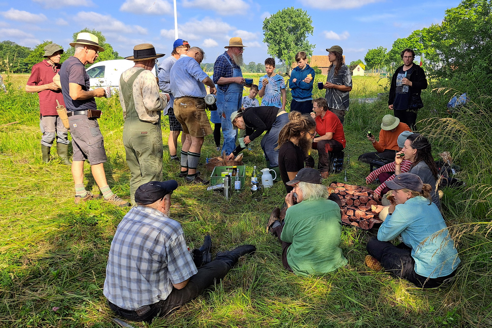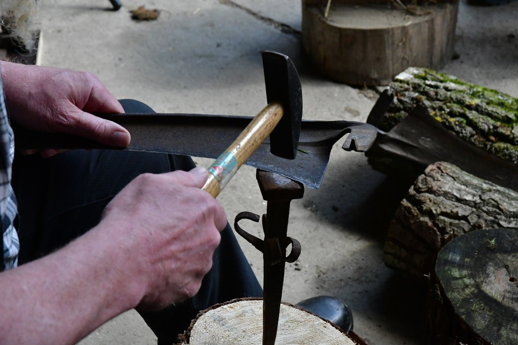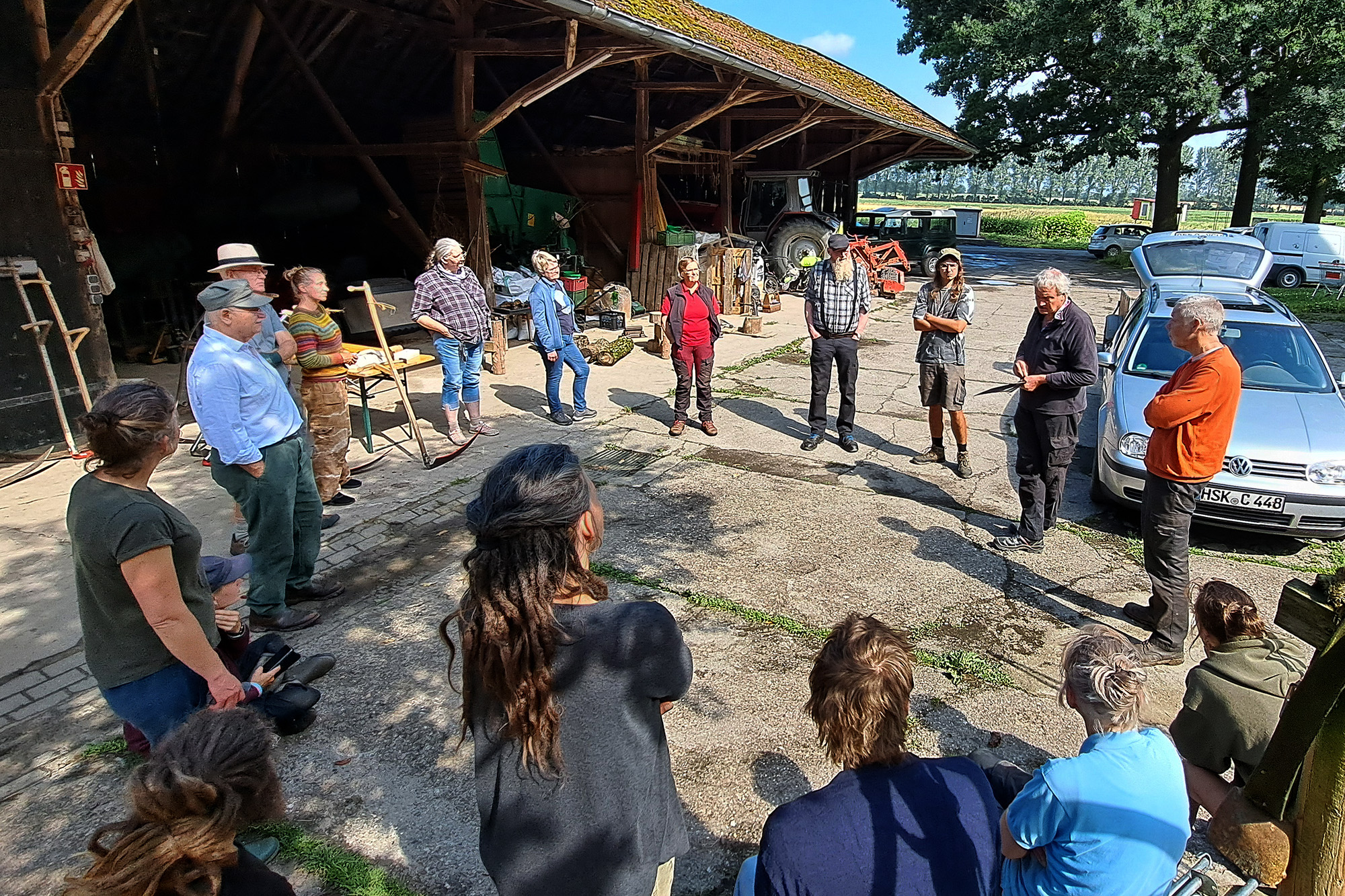 Zuvor hat Bioland-Kollege Rudolf Mathweis einer Gruppe von 15 Personen den richtigen Umgang (Dengeln, Schärfen, Mähen) mit der Sense in einem Kurs nähergebracht. Um hohes Gras mit der Sense zu schneiden, muss das Sensenblatt natürlich scharf sein, was durch das sogenannte Dengeln erreicht wird. Hierbei wird die Schneide des Sensenblattes mit kurzen Dengelhammer Schlägen so lange bearbeitet, bis die gewünschte Schärfe erreicht ist.