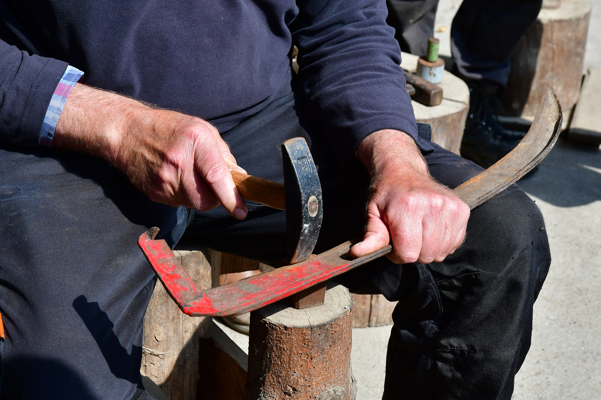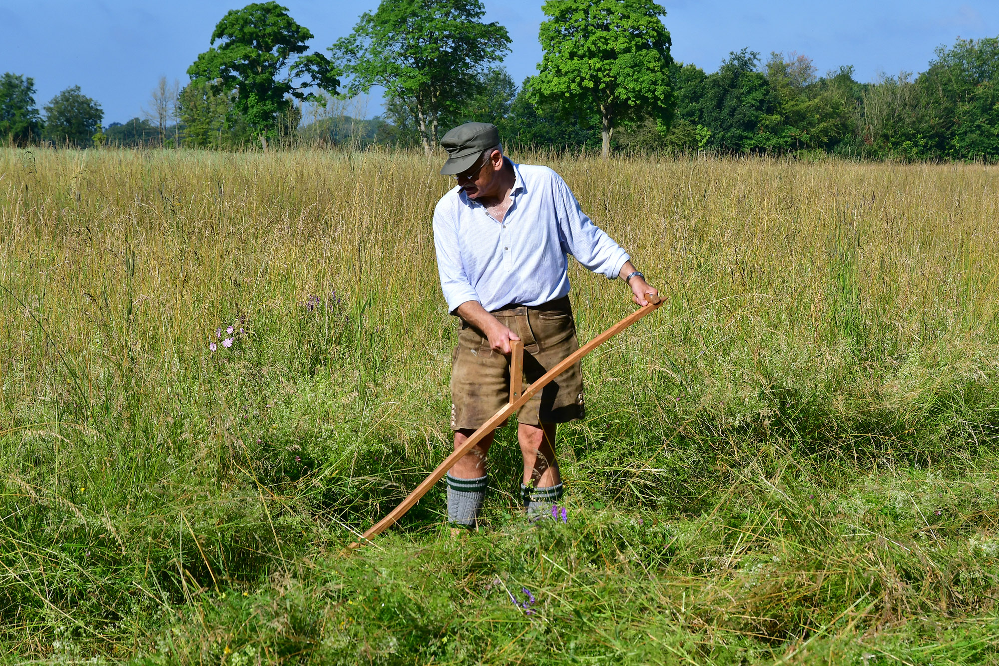 Auf steilen Hängen, kleineren Flächen oder im Privatgarten wird die Sense, ein Jahrhunderte altes Arbeitsgerät, weiterhin eingesetzt.