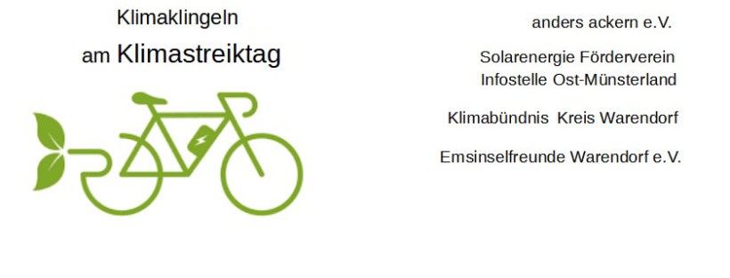 Am 20. September findet in ganz Deutschland der nächste Klimastreik statt. Im Kreis Warendorf werden sich der Verein „anders ackern e.V.“ aus Enniger, der Solarenergie Förderverein Infostelle Ost-Münsterland, das Klimabündnis im Kreis Warendorf sowie der Verein Emsinselfreunde Warendorf e.V. an der Aktion beteiligen.