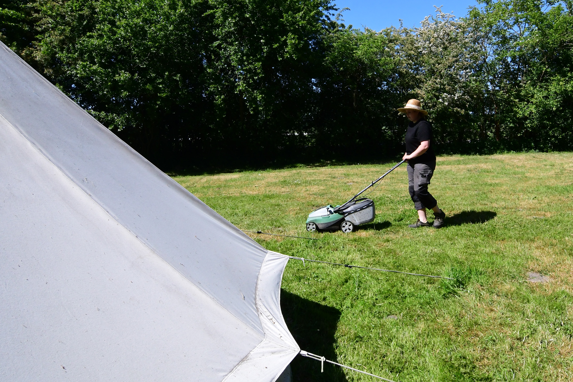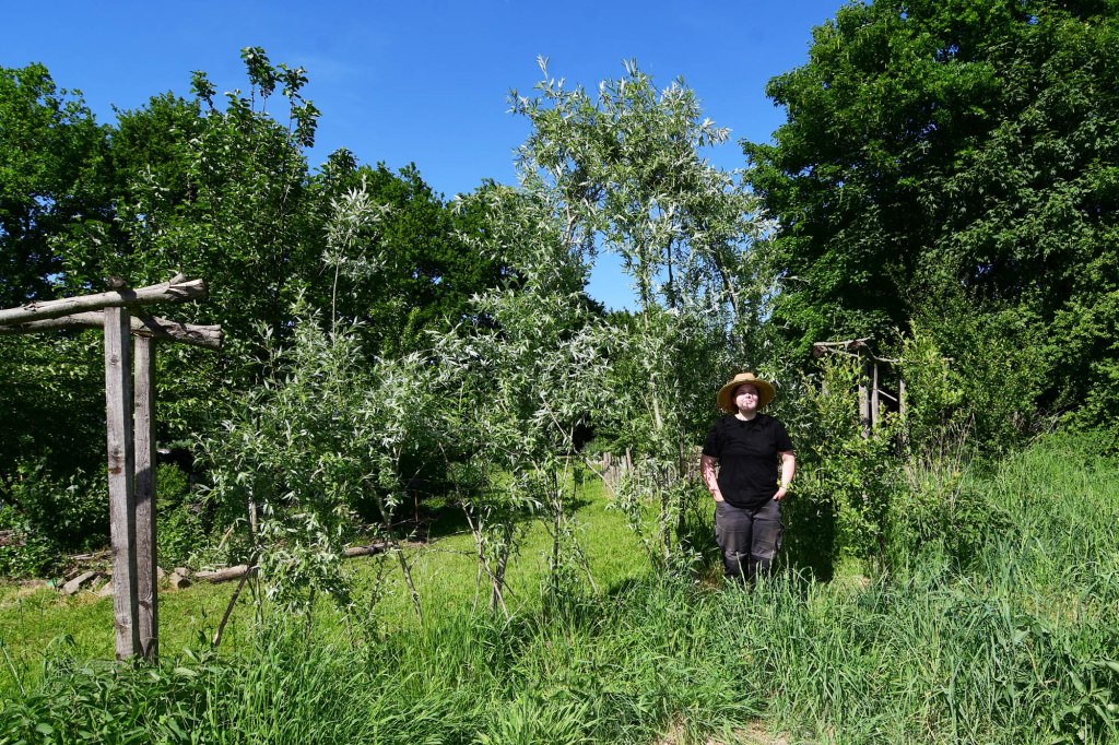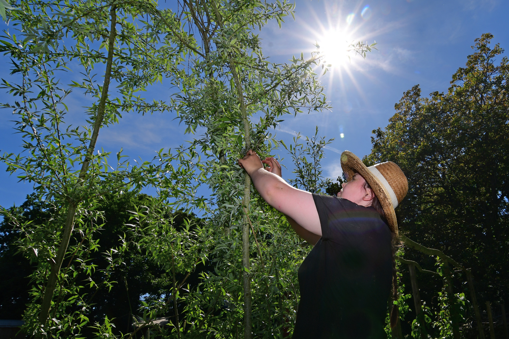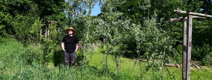 FÖJ-lerin Leona wird jetzt regelmäßig das Permakultur Waldgarten Team unterstützen: Routinearbeiten wie Rasen rund um das Tipi mähen, Wasserfass auffüllen oder frisch eingesetzt Pflanzen gießen, gehören dazu. Leonas Geschick war an der lebenden Weidenhecke gefragt. Die vor zwei Jahren aus abgeschnittenen Weidenruten angeleckte Hecke ist mittlerweile kräftig gewachsen, so konnte Leona nun längere Zweige passend einflechten.