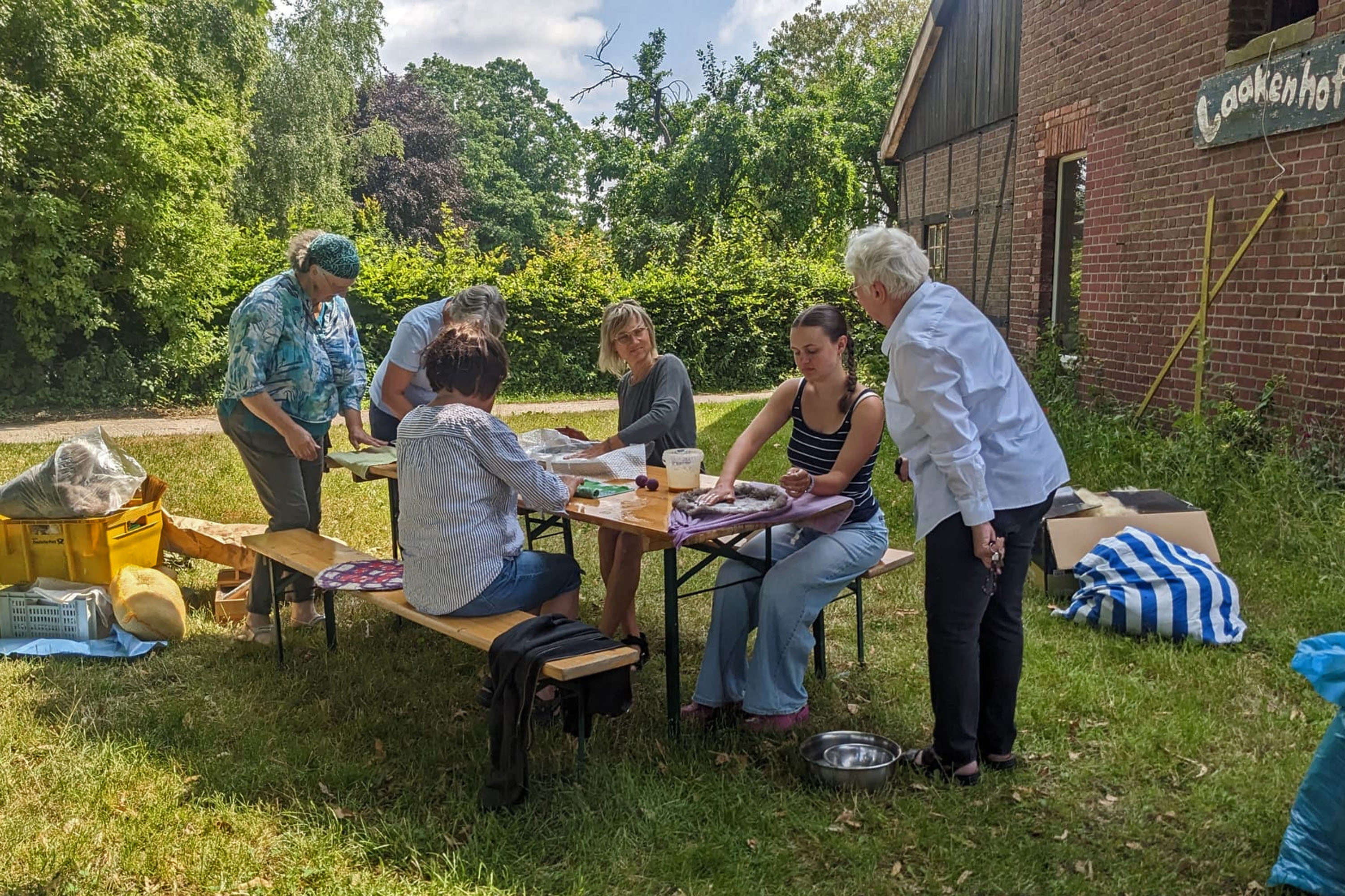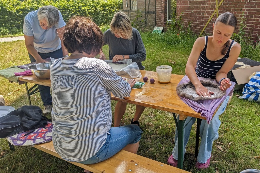 Ein herrlich sonniger Samstagvormittag auf dem Laakenhof, Tisch und Bänke unter Eichenbäumen und gemeinschaftlich wurde mit Wolle kreativ gearbeitet. Zuerst waren die Schritte zur Reinigung der Rohwolle für die Teilnehmerinnen ein wichtiger Baustein. Freundlicher Weise hatte eine Teilnehmerin spontan eigene Rohwolle von unterschiedlichen Schafen mitgebracht. Ganz verschieden in der Haarlänge und Farbe konnte ein komplettes Flies ausgebreitet werden. An einem Schaf ist nicht überall die gleiche Wolle und das ergibt auch durch die Schur ganz unterschiedliche Wolllängen. Am besten geeignet zum Spinnen sind die langen Rückenteile, diese ermöglicht feine Fäden. Die anderen Körperteile sind etwas kürzer behaart und eignen sich daher zum filzen oder polstern. Die hintere Wolle und das, was vor der Schur unterm Bauch war, ist häufig nicht zu gebrauchen, kann also als Dünger unter die Tomaten- und Gurkenkulturen des Laakenhofs und dient dort der Bodenverbesserung. So werden letztlich alle Teile sinnvoll verwendet. Die Verschmutzungen wie Stroh und Mist vorher auszusortieren, vereinfacht das Waschen vor der Verarbeitung. Natürlich geschieht das noch mit weichem Regenwasser ohne Seifenzusätze. So bleibt das wertvolle Wollfett erhalten.
