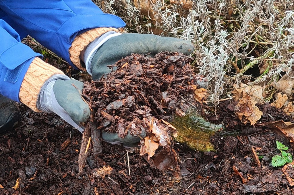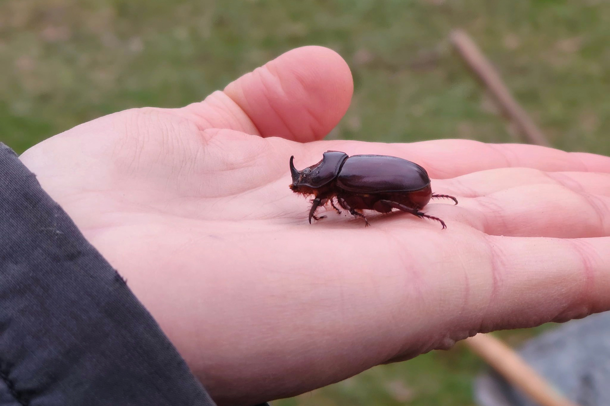 Das Permakultur Gartenteam hat kürzlich die Gartensaison im Permakultur Waldgarten eröffnet und damit begonnen, die Wege der 7 Parzellen mit neuem Mulch aufzufüllen. In zwei Stunden war der Hänger abgeräumt, die Arbeit erledigt und die Wege wieder gut begehbar. Dabei ist ein beindruckender Hornkäfer aufgetaucht, der sich im Mulch versteckt hatte.