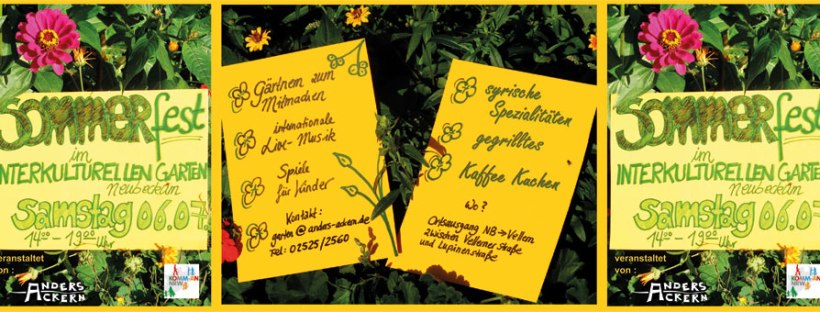 Wir freuen uns auf das zweite Sommerfest im Interkulturellen Garten! Am Samstag den 21. Juli von 14:00 Uhr bis 19:00 Uhr wollen wir gemeinsam mit euch feiern. Geplant ist: Internationale Live-Musik Spiele für Kinder Internationales Buffet Gegrilltes Kaffee & Kuchen Den interkulturellen Garten findet ihr am Ortsausgang Neubeckum Richtung Vellern zwischen Vellerner Straße und Lupinen … 21. Juli 2018 – Sommerfest im Interkulturellen Garten weiterlesen